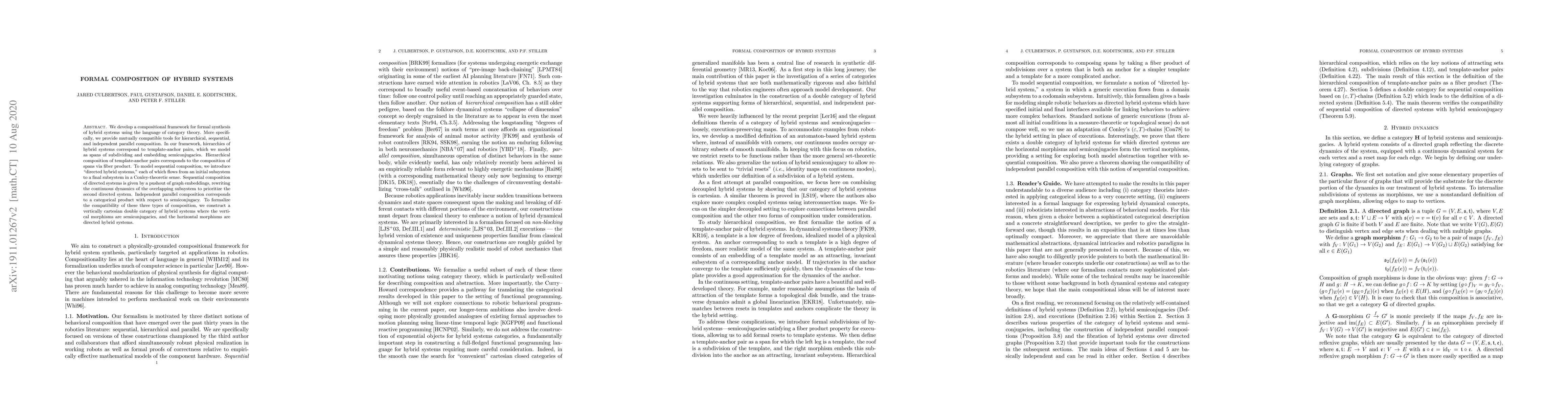 We develop a compositional framework for formal synthesis of hybrid systems using the language of category theory. More specifically, we provide mutually compatible tools for hierarchical, sequential, and independent parallel composition. In our framework, hierarchies of hybrid systems correspond to template-anchor pairs, which we model as spans of subdividing and embedding semiconjugacies. Hierarchical composition of template-anchor pairs corresponds to the composition of spans via pullback. To model sequential composition, we introduce "directed hybrid systems," each of which flows from an initial subsystem to a final subsystem in a Conley-theoretic sense. Sequential composition of directed systems is given by a pushout of graph embeddings, rewriting the continuous dynamics of the overlapping subsystem to prioritize the second directed system. Independent parallel composition corresponds to a categorical product with respect to semiconjugacy. To formalize the compatibility of these three types of composition, we construct a vertically cartesian double category of hybrid systems where the vertical morphisms are semiconjugacies, and the horizontal morphisms are directed hybrid systems.
