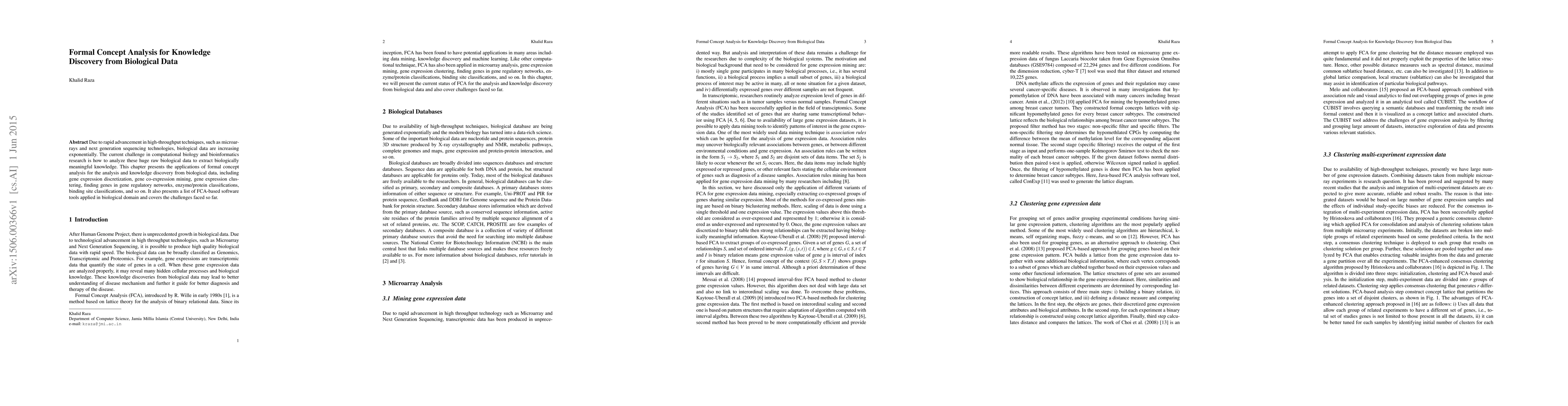 This paper reviews the application of formal concept analysis (FCA) in extracting meaningful knowledge from vast biological datasets generated by high-throughput techniques. It highlights FCA's role in gene expression analysis, co-expression mining, and protein classifications, while also discussing associated challenges and available FCA-based software tools.