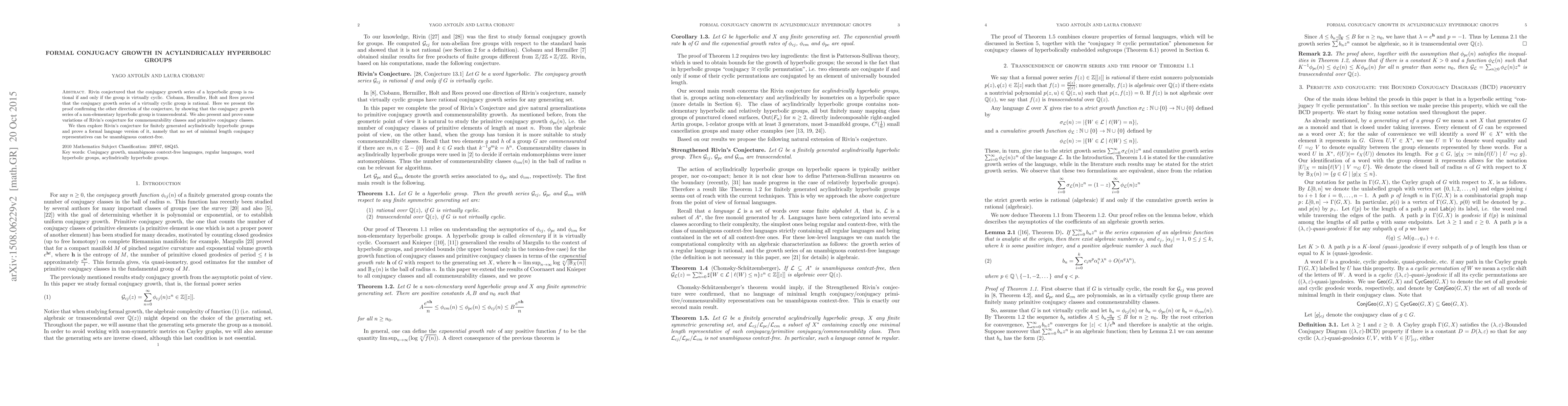 This paper confirms Rivin's conjecture for hyperbolic groups, proving that the conjugacy growth series of a non-elementary hyperbolic group is transcendental. It also extends this result to acylindrically hyperbolic groups and proves that no set of minimal length conjugacy representatives can be represented by an unambiguous context-free language.