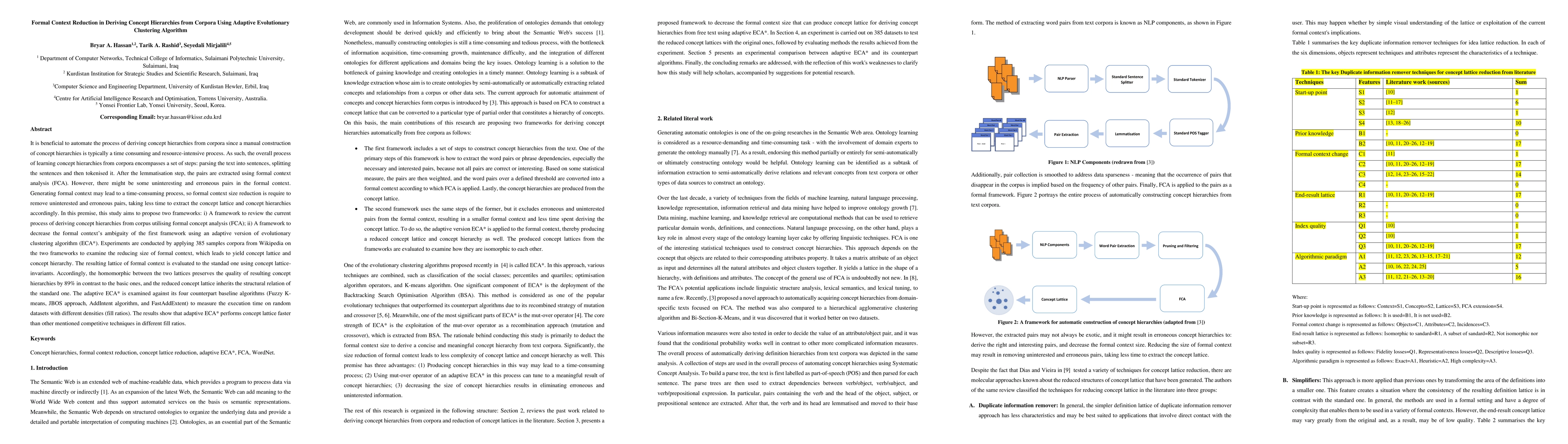 It is beneficial to automate the process of deriving concept hierarchies from corpora since a manual construction of concept hierarchies is typically a time-consuming and resource-intensive process. As such, the overall process of learning concept hierarchies from corpora encompasses a set of steps: parsing the text into sentences, splitting the sentences and then tokenising it. After the lemmatisation step, the pairs are extracted using FCA. However, there might be some uninteresting and erroneous pairs in the formal context. Generating formal context may lead to a time-consuming process, so formal context size reduction is required to remove uninterested and erroneous pairs, taking less time to extract the concept lattice and concept hierarchies accordingly. In this premise, this study aims to propose two frameworks: (1) A framework to review the current process of deriving concept hierarchies from corpus utilising FCA; (2) A framework to decrease the formal contexts ambiguity of the first framework using an adaptive version of ECA*. Experiments are conducted by applying 385 sample corpora from Wikipedia on the two frameworks to examine the reducing size of formal context, which leads to yield concept lattice and concept hierarchy. The resulting lattice of formal context is evaluated to the standard one using concept lattice-invariants. Accordingly, the homomorphic between the two lattices preserves the quality of resulting concept hierarchies by 89% in contrast to the basic ones, and the reduced concept lattice inherits the structural relation of the standard one. The adaptive ECA* is examined against its four counterpart baseline algorithms to measure the execution time on random datasets with different densities (fill ratios). The results show that adaptive ECA* performs concept lattice faster than other mentioned competitive techniques in different fill ratios.