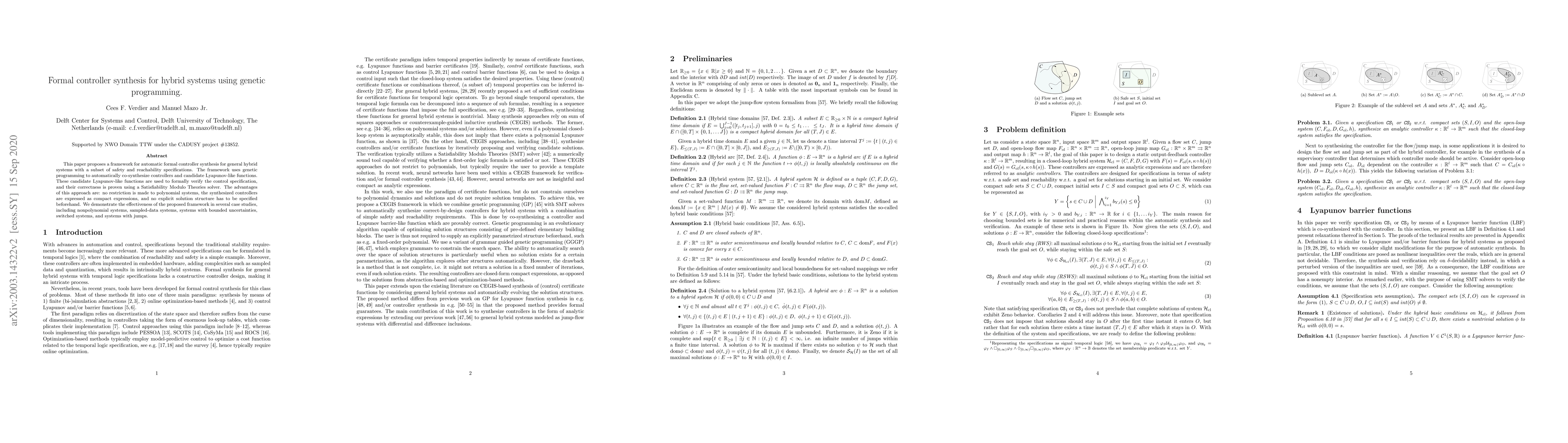 This paper presents a framework for automatic controller synthesis for hybrid systems using genetic programming, co-synthesizing controllers and Lyapunov-like functions to verify control specifications. The approach is versatile, applicable to nonpolynomial systems, and does not require predefined solution structures.