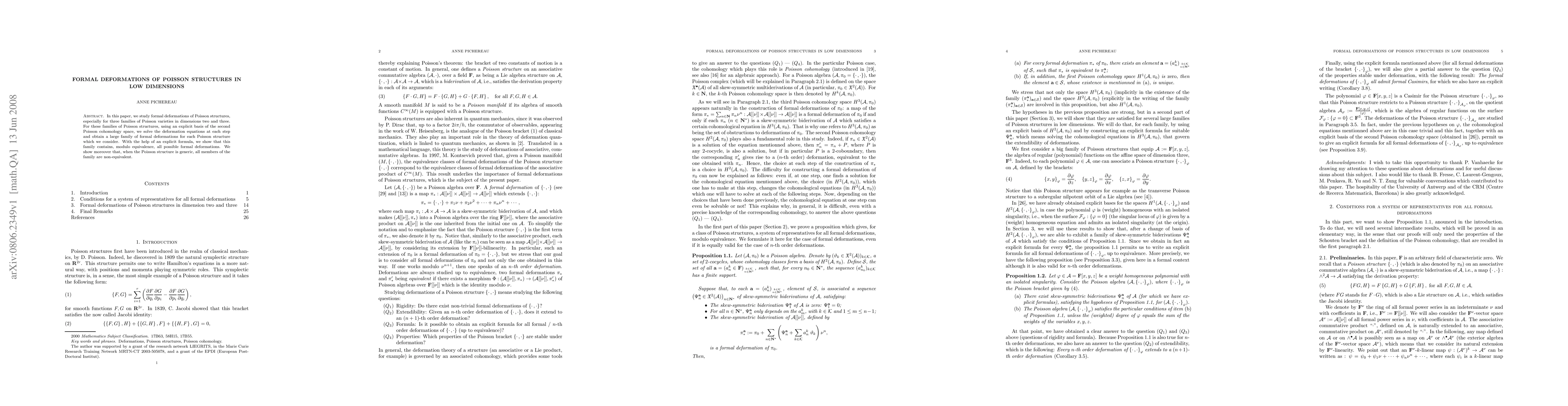 This paper explores formal deformations of Poisson structures in dimensions two and three, particularly for three families of Poisson varieties. The authors derive a comprehensive family of formal deformations using explicit solutions to deformation equations and demonstrate that this family encompasses all possible formal deformations, showing non-equivalence for generic structures.