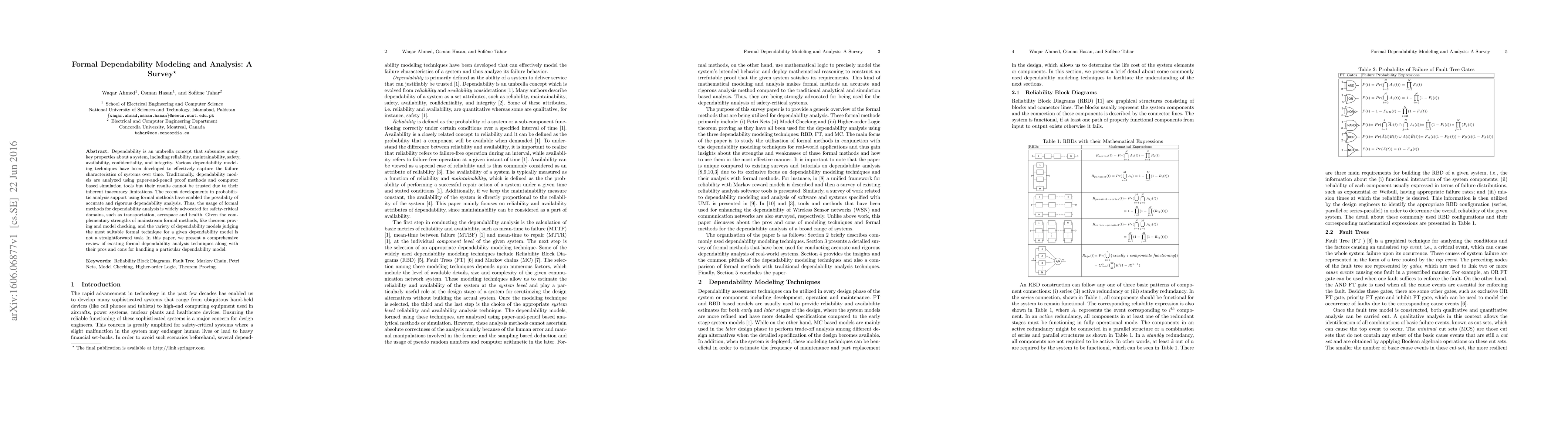 This paper surveys formal methods for dependability modeling and analysis, emphasizing their accuracy and rigor compared to traditional approaches. It discusses the strengths of various formal techniques, such as theorem proving and model checking, and provides a comparative overview of their suitability for different dependability models.
