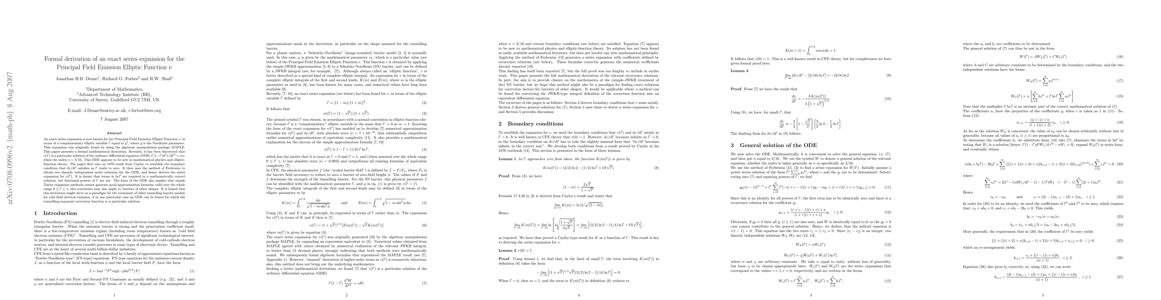 An exact series expansion is now known for the Principal Field Emission Elliptic Function v, in terms of a complementary elliptic variable l' equal to y*y, where y is the Nordheim parameter. This expansion was originally found by using the algebraic manipulation package MAPLE. This paper presents a formal mathematical derivation. It has been discovered that v(l') is a particular solution of the ordinary differential equation (ODE) l'(1-l')d^2v/dl'^2=nv, when the index n = 3/16. This ODE appears to be new in mathematical physics and elliptic-function theory. The paper first uses an 1876 result from Cayley to establish the boundary condition that dv/dl' satisfies as l' tends to zero. It then uses the method of Frobenius to obtain two linearly independent series solutions for the ODE, and hence derives the series expansion for v(l'). It is shown that terms in ln{l'} are required in a mathematically correct solution, but fractional powers of l' are not. The form of the ODE also implies that it is mathematically impossible for simple Taylor expansion methods to generate good approximation formulae valid over the whole range 0 =< l' =< 1; this conclusion may also apply to barriers of other shapes. It is hoped that this derivation might serve as a paradigm for the treatment of other tunnelling barrier models for cold field electron emission, if in any particular case an ODE can be found for which the tunnelling-exponent correction function is a particular solution.