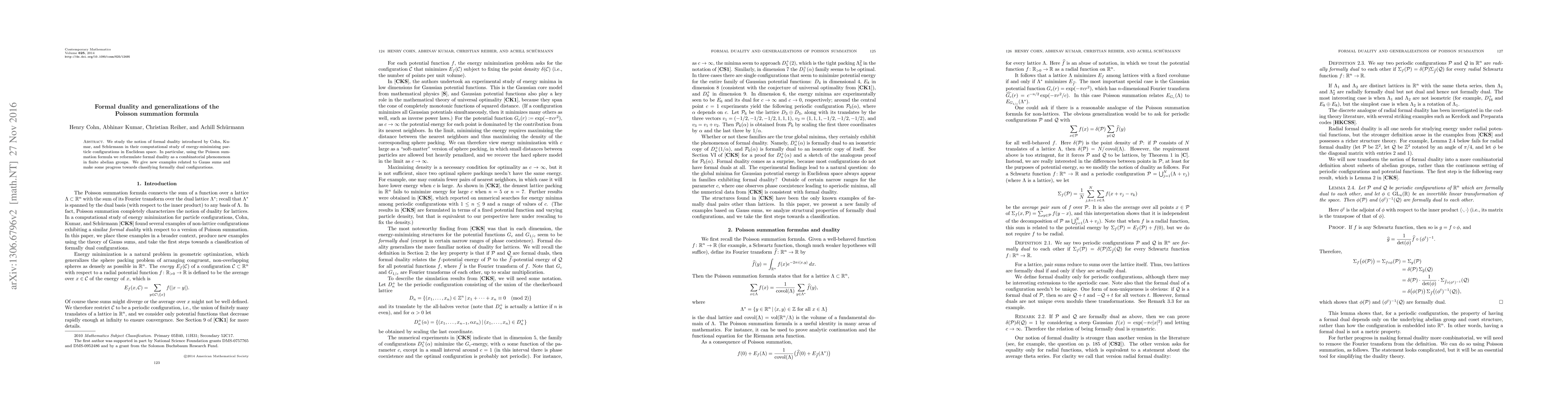 This paper explores formal duality in the context of energy-minimizing particle configurations and reformulates it using the Poisson summation formula in finite abelian groups. It provides new examples involving Gauss sums and advances the classification of formally dual configurations.