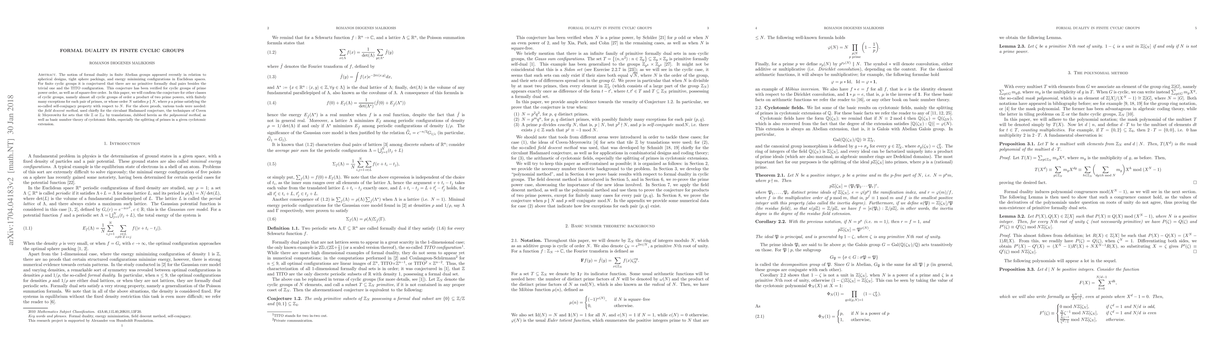 The notion of formal duality in finite Abelian groups appeared recently in relation to spherical designs, tight sphere packings, and energy minimizing configurations in Euclidean spaces. For finite cyclic groups it is conjectured that there are no primitive formally dual pairs besides the trivial one and the TITO configuration. This conjecture has been verified for cyclic groups of prime power order, as well as of square-free order. In this paper, we will confirm the conjecture for other classes of cyclic groups, namely almost all cyclic groups of order a product of two prime powers, with finitely many exceptions for each pair of primes, or whose order $N$ satisfies $p\mid\!\mid N$, where $p$ a prime satisfying the so-called self-conjugacy property with respect to $N$. For the above proofs, various tools were needed: the field descent method, used chiefly for the circulant Hadamard conjecture, the techniques of Coven & Meyerowitz for sets that tile $\mathbb{Z}$ or $\mathbb{Z}_N$ by translations, dubbed herein as the polynomial method, as well as basic number theory of cyclotomic fields, especially the splitting of primes in a given cyclotomic extension.