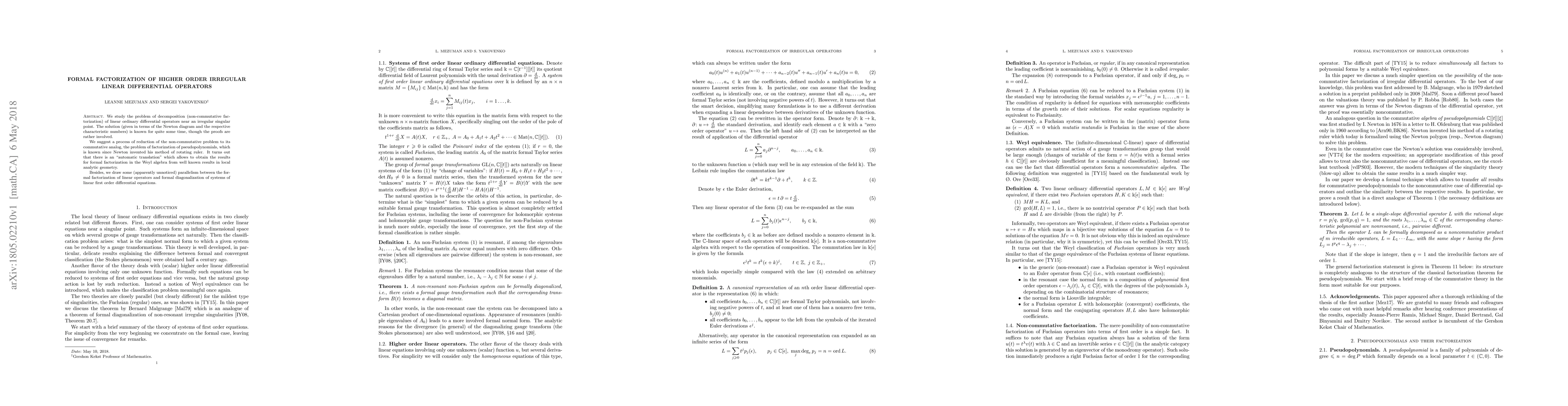 We study the problem of decomposition (non-commutative factorization) of linear ordinary differential operators near an irregular singular point. The solution (given in terms of the Newton diagram and the respective characteristic numbers) is known for quite some time, though the proofs are rather involved. We suggest a process of reduction of the non-commutative problem to its commutative analog, the problem of factorization of pseudopolynomials, which is known since Newton invented his method of rotating ruler. It turns out that there is an "automatic translation" which allows to obtain the results for formal factorization in the Weyl algebra from well known results in local analytic geometry. Besides, we draw some (apparently unnoticed) parallelism between the formal factorization of linear operators and formal diagonalization of systems of linear first order differential equations.