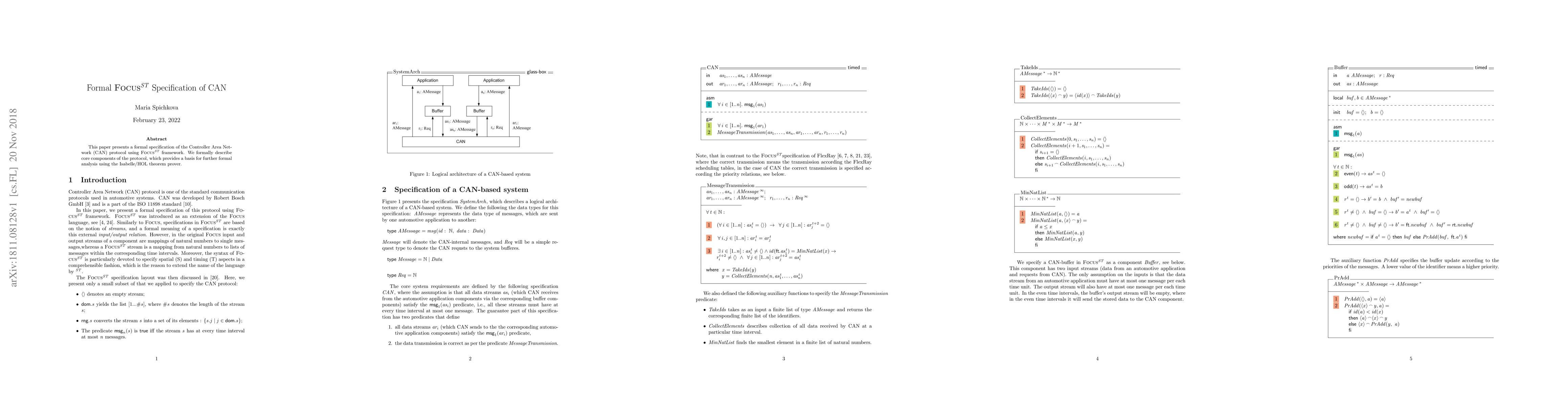 This paper presents a formal specification of the CAN protocol using FocusST, enabling rigorous analysis with the Isabelle/HOL theorem prover to validate its core components. The formal description lays the groundwork for subsequent verification and validation efforts.