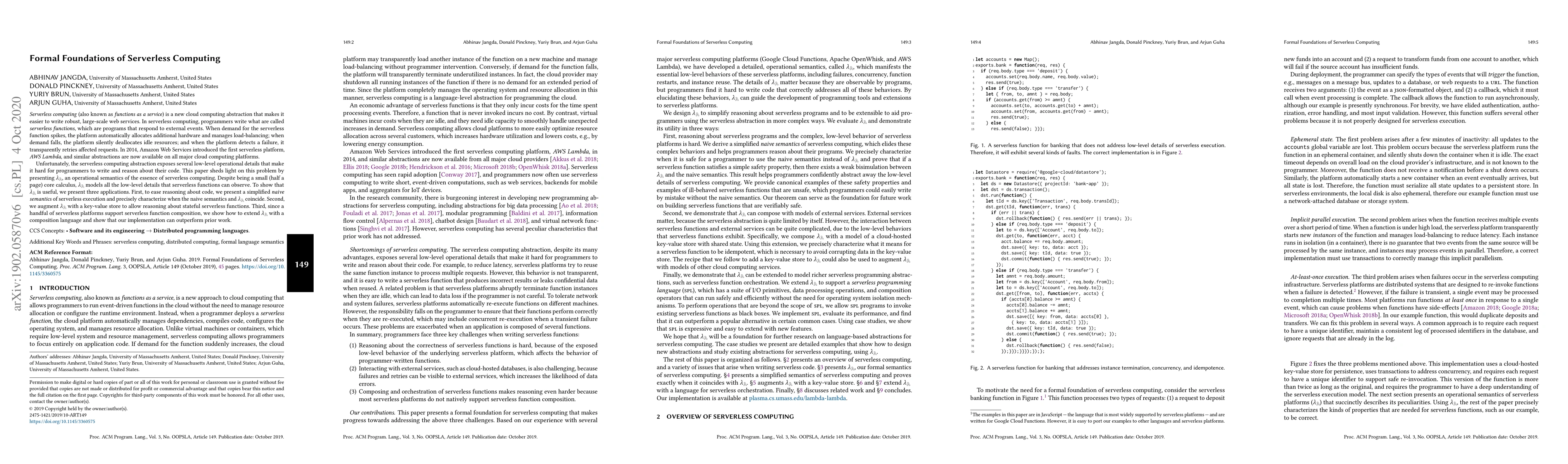 Serverless computing (also known as functions as a service) is a new cloud computing abstraction that makes it easier to write robust, large-scale web services. In serverless computing, programmers write what are called serverless functions, and the cloud platform transparently manages the operating system, resource allocation, load-balancing, and fault tolerance. When demand for the service spikes, the platform automatically allocates additional hardware to the service and manages load-balancing; when demand falls, the platform silently deallocates idle resources; and when the platform detects a failure, it transparently retries affected requests. In 2014, Amazon Web Services introduced the first serverless platform, AWS Lambda, and similar abstractions are now available on all major cloud computing platforms. Unfortunately, the serverless computing abstraction exposes several low-level operational details that make it hard for programmers to write and reason about their code. This paper sheds light on this problem by presenting $\lambda_\Lambda$, an operational semantics of the essence of serverless computing. Despite being a small (half a page) core calculus, $\lambda_\Lambda$ models all the low-level details that serverless functions can observe. To show that $\lambda_\Lambda$ is useful, we present three applications. First, to ease reasoning about code, we present a simplified naive semantics of serverless execution and precisely characterize when the naive semantics and $\lambda_\Lambda$ coincide. Second, we augment $\lambda_\Lambda$ with a key-value store to allow reasoning about stateful serverless functions. Third, since a handful of serverless platforms support serverless function composition, we show how to extend $\lambda_\Lambda$ with a composition language. We have implemented this composition language and show that it outperforms prior work.