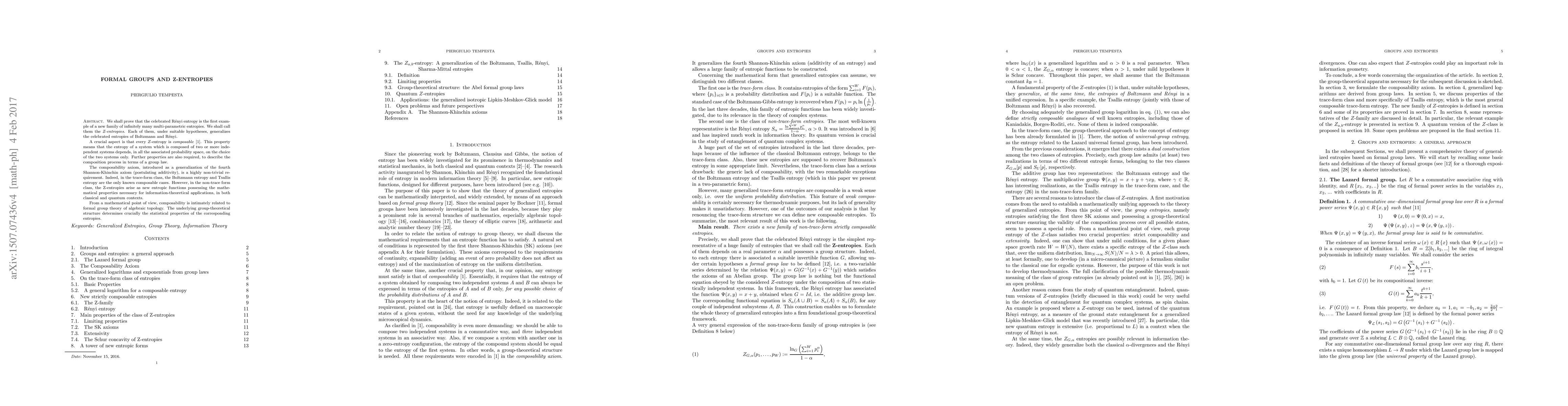 We shall prove that the celebrated R\'enyi entropy is the first example of a new family of infinitely many multi-parametric entropies. We shall call them the $Z$-entropies. Each of them, under suitable hypotheses, generalizes the celebrated entropies of Boltzmann and R\'enyi. A crucial aspect is that every $Z$-entropy is composable [1]. This property means that the entropy of a system which is composed of two or more independent systems depends, in all the associated probability space, on the choice of the two systems only. Further properties are also required, to describe the composition process in terms of a group law. The composability axiom, introduced as a generalization of the fourth Shannon-Khinchin axiom (postulating additivity), is a highly non-trivial requirement. Indeed, in the trace-form class, the Boltzmann entropy and Tsallis entropy are the only known composable cases. However, in the non-trace form class, the $Z$-entropies arise as new entropic functions possessing the mathematical properties necessary for information-theoretical applications, in both classical and quantum contexts. From a mathematical point of view, composability is intimately related to formal group theory of algebraic topology. The underlying group-theoretical structure determines crucially the statistical properties of the corresponding entropies.