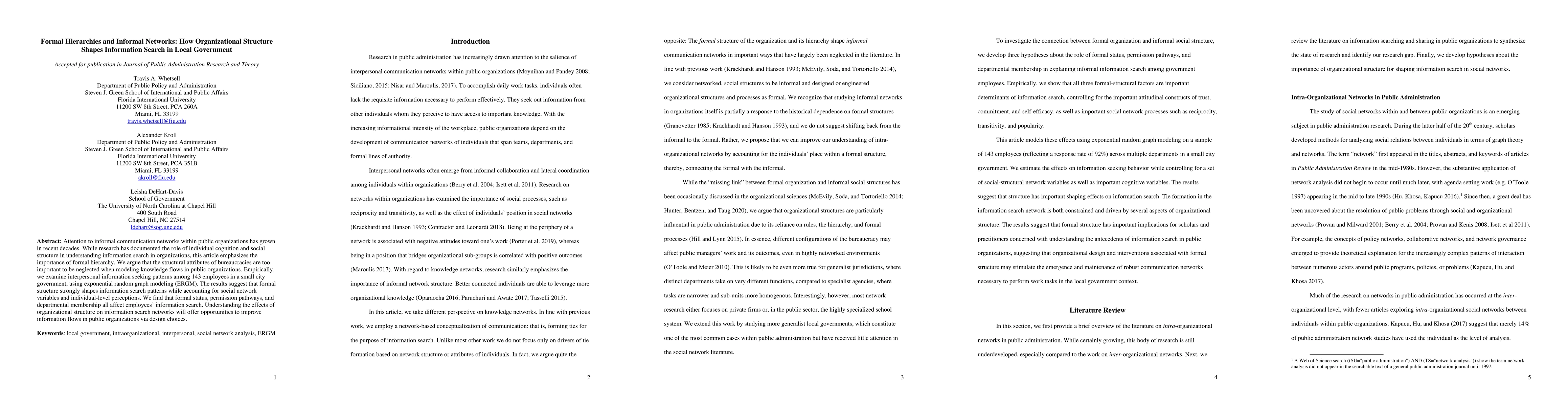 Attention to informal communication networks within public organizations has grown in recent decades. While research has documented the role of individual cognition and social structure in understanding information search in organizations, this article emphasizes the importance of formal hierarchy. We argue that the structural attributes of bureaucracies are too important to be neglected when modeling knowledge flows in public organizations. Empirically, we examine interpersonal information seeking patterns among 143 employees in a small city government, using exponential random graph modeling (ERGM). The results suggest that formal structure strongly shapes information search patterns while accounting for social network variables and individual level perceptions. We find that formal status, permission pathways, and departmental membership all affect the information search of employees. Understanding the effects of organizational structure on information search networks will offer opportunities to improve information flows in public organizations via design choices.