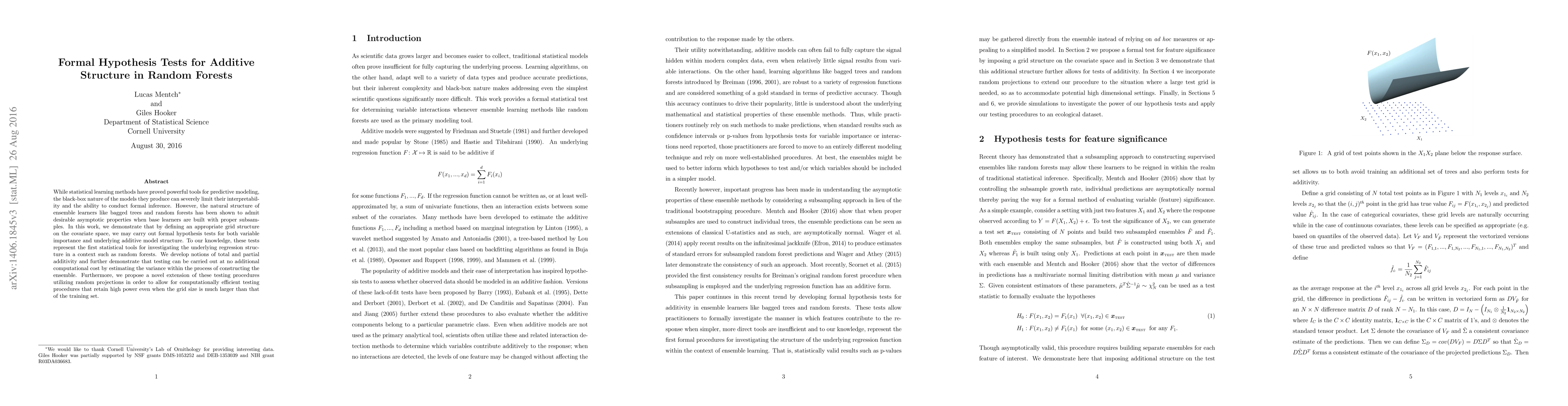 Researchers developed statistical tests to analyze the underlying structure of random forests, enabling formal inference about variable importance and additive model structure without adding computational cost. These tests can be extended for larger grid sizes using random projections.