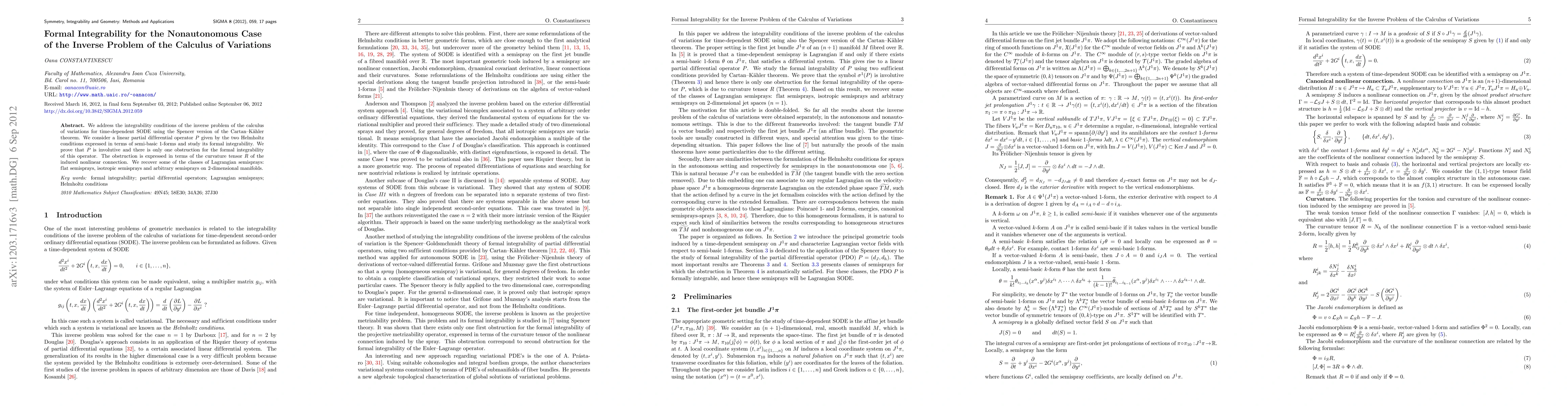 We address the integrability conditions of the inverse problem of the calculus of variations for time-dependent SODE using the Spencer version of the Cartan-K\"ahler theorem. We consider a linear partial differential operator $P$ given by the two Helmholtz conditions expressed in terms of semi-basic 1-forms and study its formal integrability. We prove that $P$ is involutive and there is only one obstruction for the formal integrability of this operator. The obstruction is expressed in terms of the curvature tensor $R$ of the induced nonlinear connection. We recover some of the classes of Lagrangian semisprays: flat semisprays, isotropic semisprays and arbitrary semisprays on 2-dimensional manifolds.
