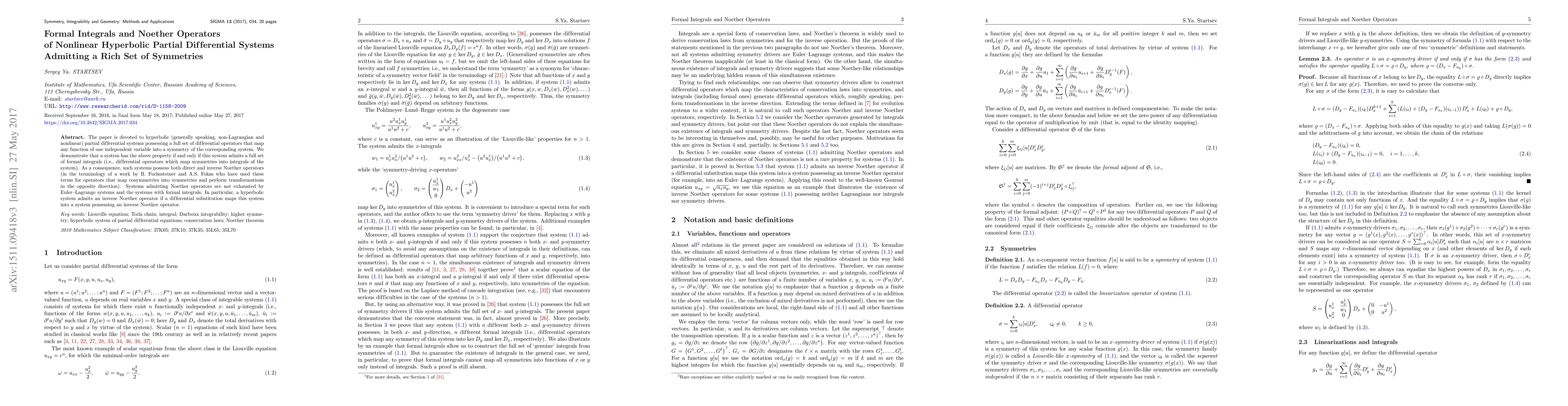 This paper explores hyperbolic partial differential systems with a rich set of symmetries, demonstrating that such systems possess a full set of formal integrals and Noether operators, which map symmetries into integrals and vice versa, expanding beyond Euler-Lagrange systems and those with formal integrals.