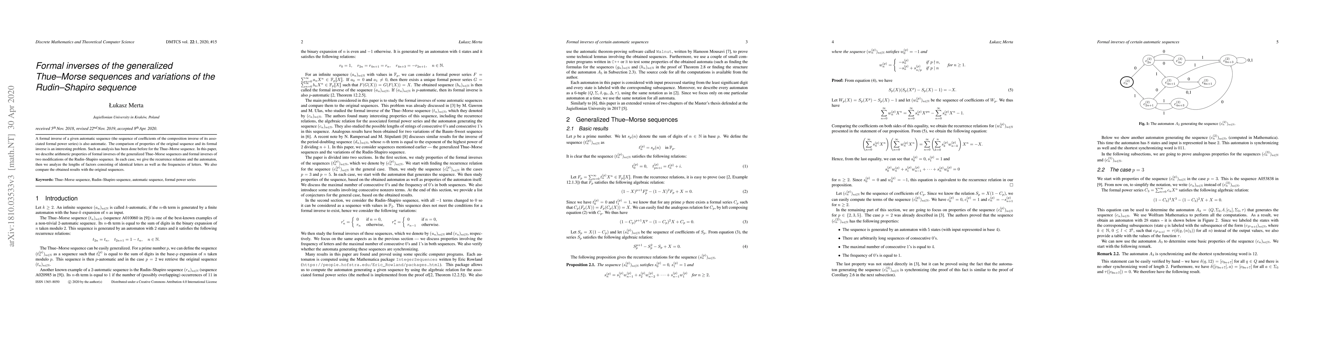 This paper investigates the formal inverses of generalized Thue-Morse sequences and variations of the Rudin-Shapiro sequence, demonstrating that these inverses retain automatic properties. It provides recurrence relations, automaton models, and analyzes string lengths and letter frequencies, comparing these findings to the original sequences.