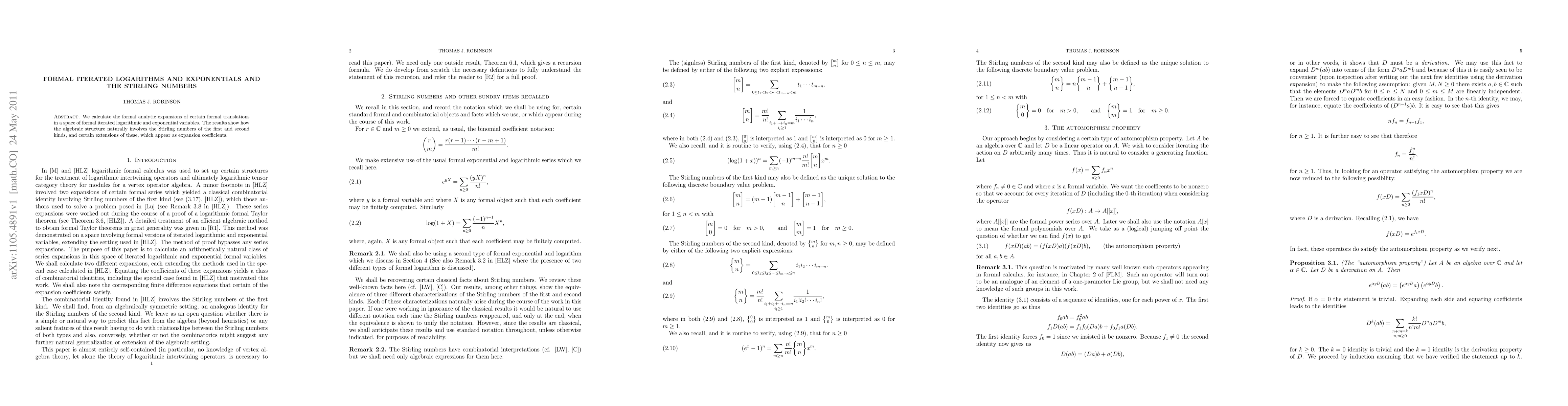We calculate the formal analytic expansions of certain formal translations in a space of formal iterated logarithmic and exponential variables. The results show how the algebraic structure naturally involves the Stirling numbers of the first and second kinds, and certain extensions of these, which appear as expansion coefficients.