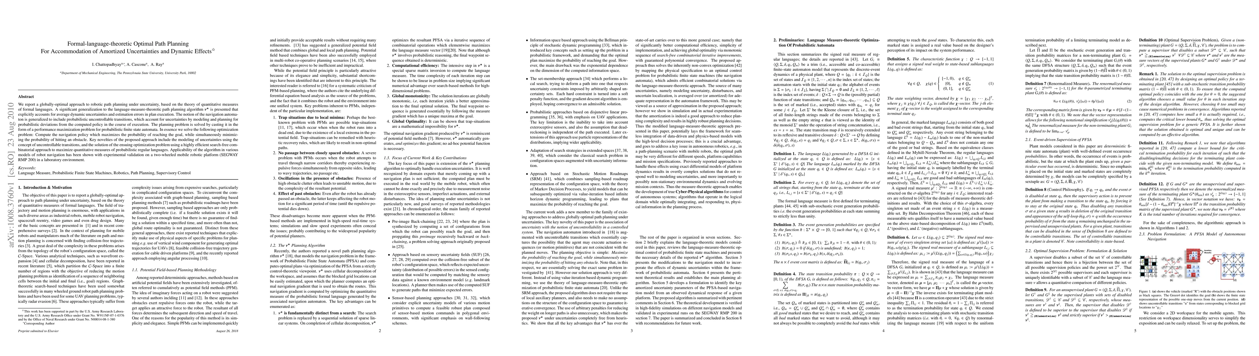 We report a globally-optimal approach to robotic path planning under uncertainty, based on the theory of quantitative measures of formal languages. A significant generalization to the language-measure-theoretic path planning algorithm $\nustar$ is presented that explicitly accounts for average dynamic uncertainties and estimation errors in plan execution. The notion of the navigation automaton is generalized to include probabilistic uncontrollable transitions, which account for uncertainties by modeling and planning for probabilistic deviations from the computed policy in the course of execution. The planning problem is solved by casting it in the form of a performance maximization problem for probabilistic finite state automata. In essence we solve the following optimization problem: Compute the navigation policy which maximizes the probability of reaching the goal, while simultaneously minimizing the probability of hitting an obstacle. Key novelties of the proposed approach include the modeling of uncertainties using the concept of uncontrollable transitions, and the solution of the ensuing optimization problem using a highly efficient search-free combinatorial approach to maximize quantitative measures of probabilistic regular languages. Applicability of the algorithm in various models of robot navigation has been shown with experimental validation on a two-wheeled mobile robotic platform (SEGWAY RMP 200) in a laboratory environment.