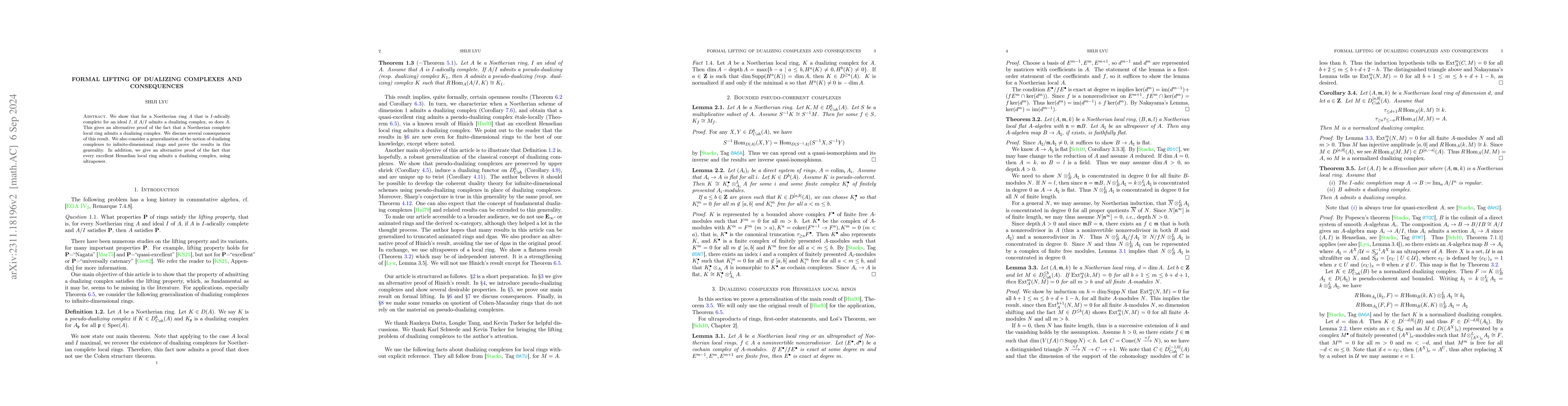 This paper demonstrates that if a Noetherian ring $A$ is $I$-adically complete and $A/I$ has a dualizing complex, then $A$ also possesses a dualizing complex. It further explores consequences of this result and extends the concept of dualizing complexes to infinite-dimensional rings.
