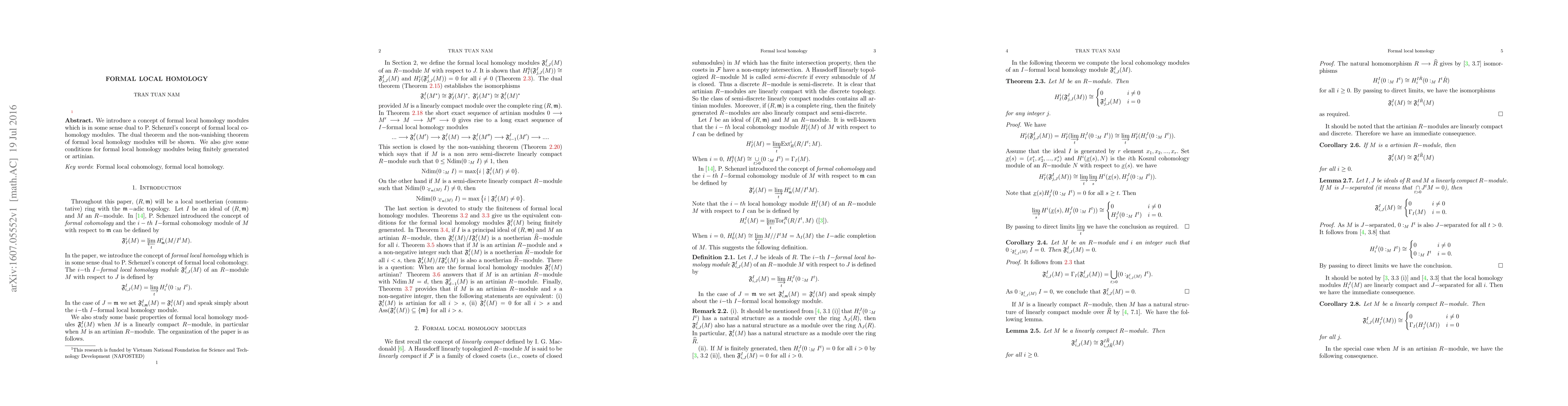 This paper introduces formal local homology modules, a dual concept to formal local cohomology, and proves a dual theorem and a non-vanishing theorem. It also discusses conditions under which these modules are finitely generated or artinian.