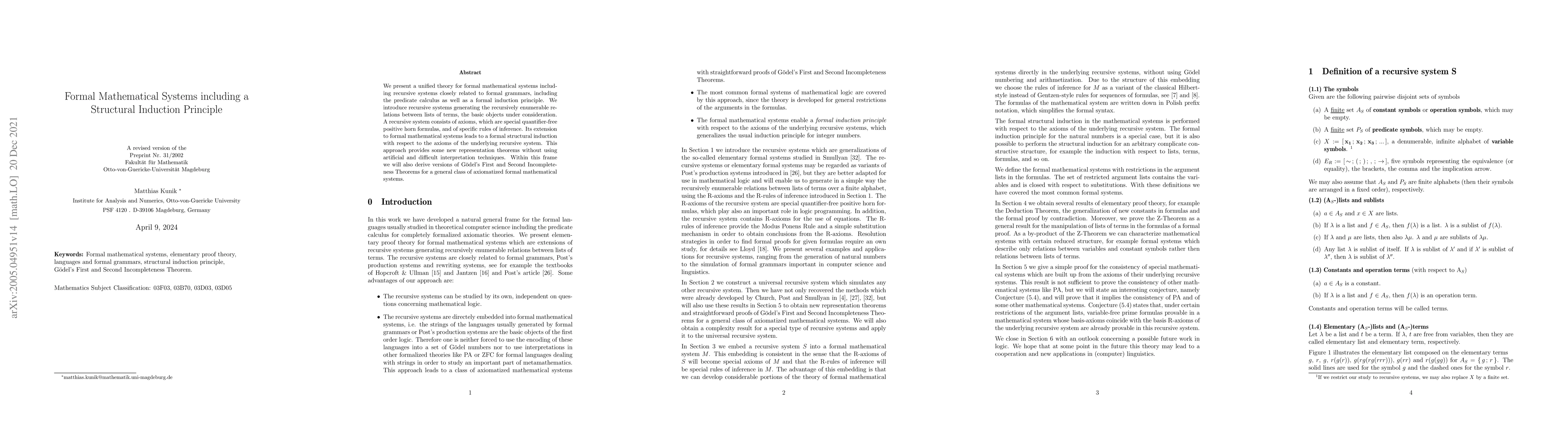 We present a unified theory for formal mathematical systems including recursive systems closely related to formal grammars, including the predicate calculus as well as a formal induction principle. We introduce recursive systems generating the recursively enumerable relations between lists of terms, the basic objects under consideration. A recursive system consists of axioms, which are special quantifier-free positive horn formulas, and of specific rules of inference. Its extension to formal mathematical systems leads to a formal structural induction with respect to the axioms of the underlying recursive system. This approach provides some new representation theorems without using artificial and difficult interpretation techniques. Within this frame we will also derive versions of G\"odel's First and Second Incompleteness Theorems for a general class of axiomatized formal mathematical systems.