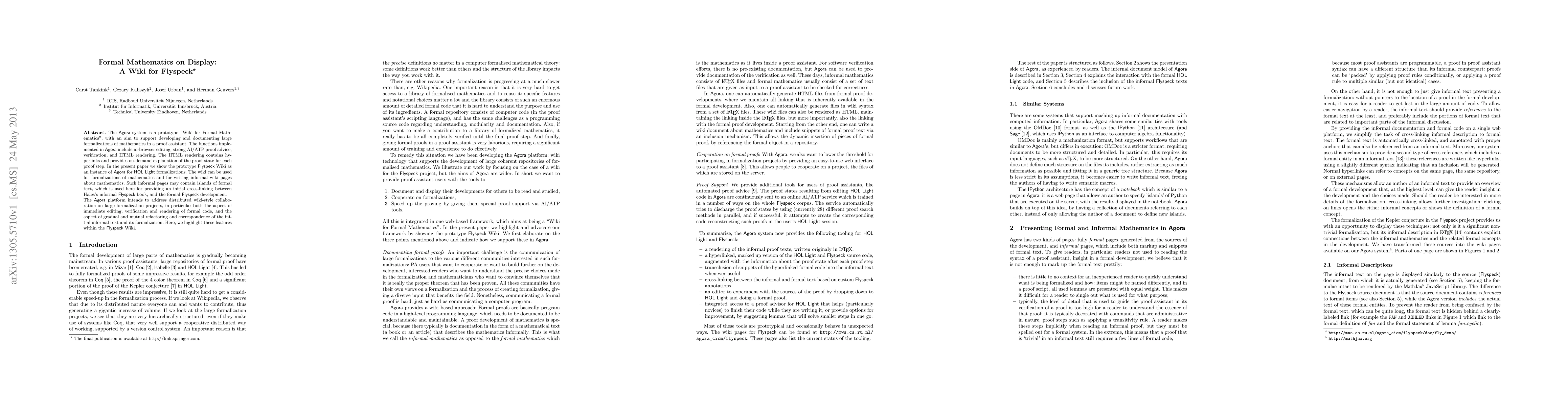 The Agora system is a prototype wiki for formal mathematics, enabling collaborative editing, proof verification, and rendering of formal proofs in a proof assistant. The Flyspeck Wiki, a demonstration of Agora, supports both formal and informal mathematical documentation, linking Hales's informal book to its formal counterpart.