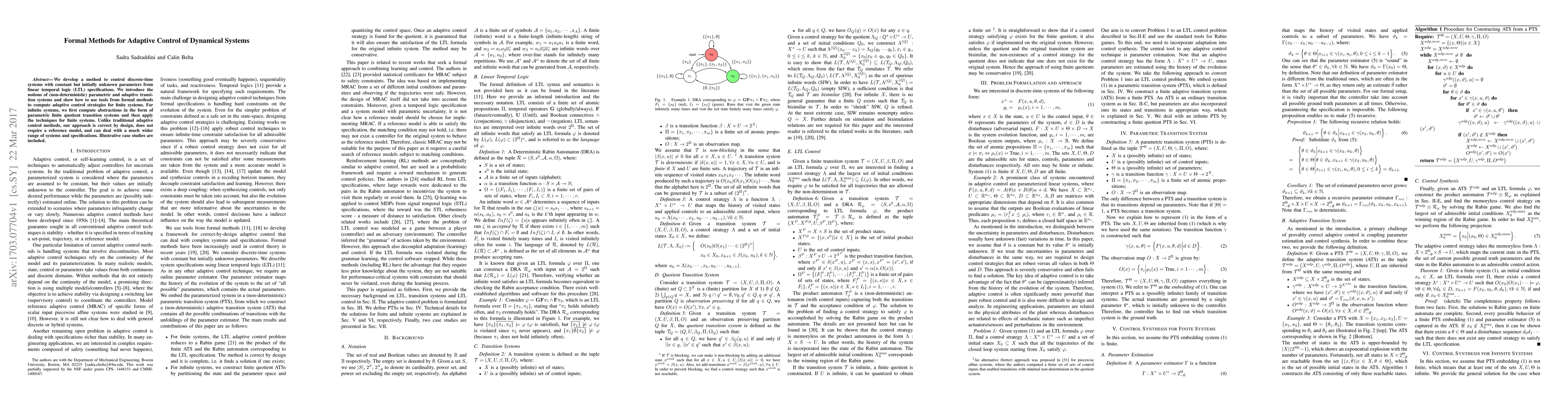 This paper proposes a formal method for adaptive control of discrete-time dynamical systems with unknown parameters, leveraging linear temporal logic specifications. The method employs parametric and adaptive transition systems, ensuring correctness without a reference model, and extends to both finite and infinite systems through abstraction techniques.