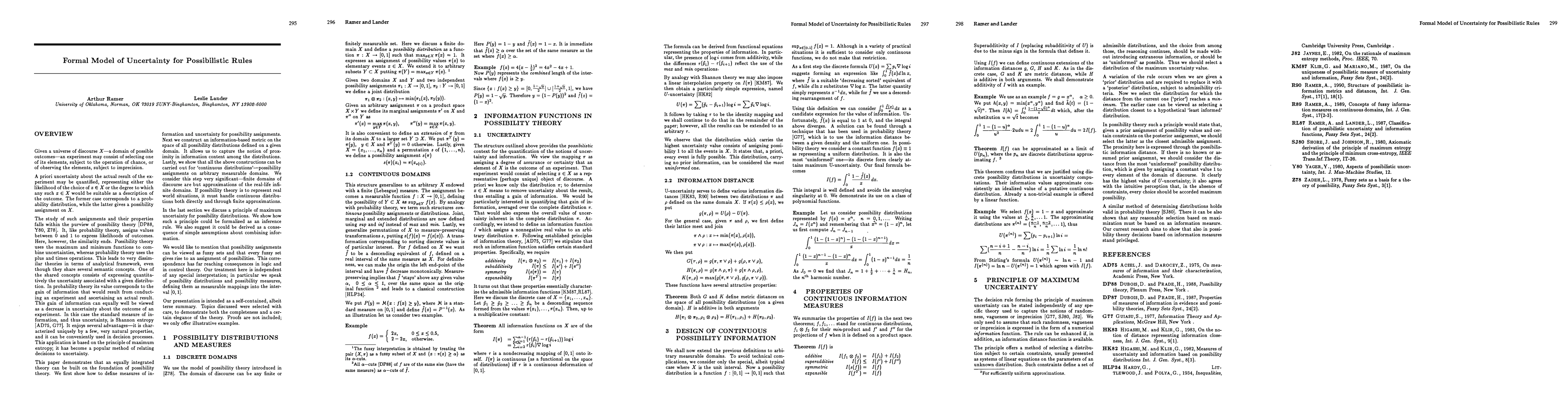 Given a universe of discourse X-a domain of possible outcomes-an experiment may consist of selecting one of its elements, subject to the operation of chance, or of observing the elements, subject to imprecision. A priori uncertainty about the actual result of the experiment may be quantified, representing either the likelihood of the choice of :r_X or the degree to which any such X would be suitable as a description of the outcome. The former case corresponds to a probability distribution, while the latter gives a possibility assignment on X. The study of such assignments and their properties falls within the purview of possibility theory [DP88, Y80, Z783. It, like probability theory, assigns values between 0 and 1 to express likelihoods of outcomes. Here, however, the similarity ends. Possibility theory uses the maximum and minimum functions to combine uncertainties, whereas probability theory uses the plus and times operations. This leads to very dissimilar theories in terms of analytical framework, even though they share several semantic concepts. One of the shared concepts consists of expressing quantitatively the uncertainty associated with a given distribution. In probability theory its value corresponds to the gain of information that would result from conducting an experiment and ascertaining an actual result. This gain of information can equally well be viewed as a decrease in uncertainty about the outcome of an experiment. In this case the standard measure of information, and thus uncertainty, is Shannon entropy [AD75, G77]. It enjoys several advantages-it is characterized uniquely by a few, very natural properties, and it can be conveniently used in decision processes. This application is based on the principle of maximum entropy; it has become a popular method of relating decisions to uncertainty. This paper demonstrates that an equally integrated theory can be built on the foundation of possibility theory. We first show how to define measures of in formation and uncertainty for possibility assignments. Next we construct an information-based metric on the space of all possibility distributions defined on a given domain. It allows us to capture the notion of proximity in information content among the distributions. Lastly, we show that all the above constructions can be carried out for continuous distributions-possibility assignments on arbitrary measurable domains. We consider this step very significant-finite domains of discourse are but approximations of the real-life infinite domains. If possibility theory is to represent real world situations, it must handle continuous distributions both directly and through finite approximations. In the last section we discuss a principle of maximum uncertainty for possibility distributions. We show how such a principle could be formalized as an inference rule. We also suggest it could be derived as a consequence of simple assumptions about combining information. We would like to mention that possibility assignments can be viewed as fuzzy sets and that every fuzzy set gives rise to an assignment of possibilities. This correspondence has far reaching consequences in logic and in control theory. Our treatment here is independent of any special interpretation; in particular we speak of possibility distributions and possibility measures, defining them as measurable mappings into the interval [0, 1]. Our presentation is intended as a self-contained, albeit terse summary. Topics discussed were selected with care, to demonstrate both the completeness and a certain elegance of the theory. Proofs are not included; we only offer illustrative examples.
