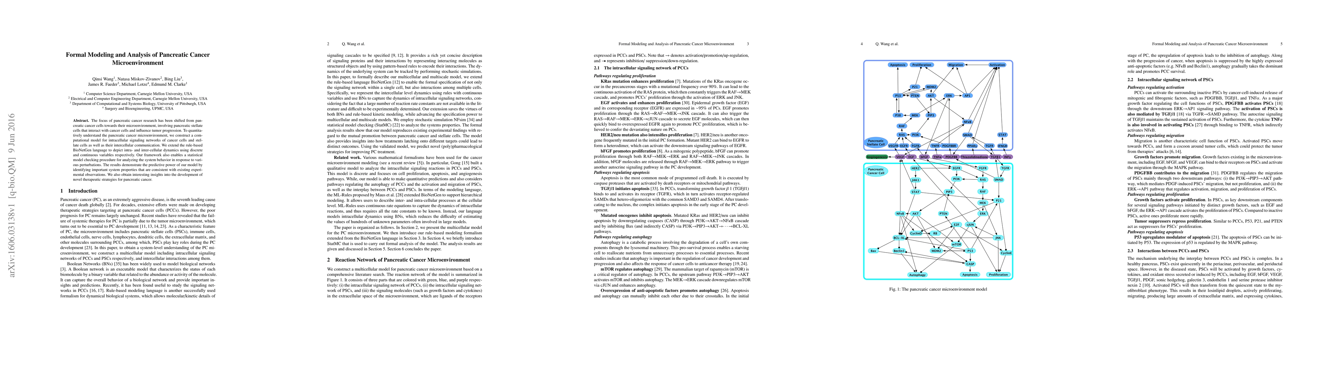 The focus of pancreatic cancer research has been shifted from pancreatic cancer cells towards their microenvironment, involving pancreatic stellate cells that interact with cancer cells and influence tumor progression. To quantitatively understand the pancreatic cancer microenvironment, we construct a computational model for intracellular signaling networks of cancer cells and stellate cells as well as their intercellular communication. We extend the rule-based BioNetGen language to depict intra- and inter-cellular dynamics using discrete and continuous variables respectively. Our framework also enables a statistical model checking procedure for analyzing the system behavior in response to various perturbations. The results demonstrate the predictive power of our model by identifying important system properties that are consistent with existing experimental observations. We also obtain interesting insights into the development of novel therapeutic strategies for pancreatic cancer.