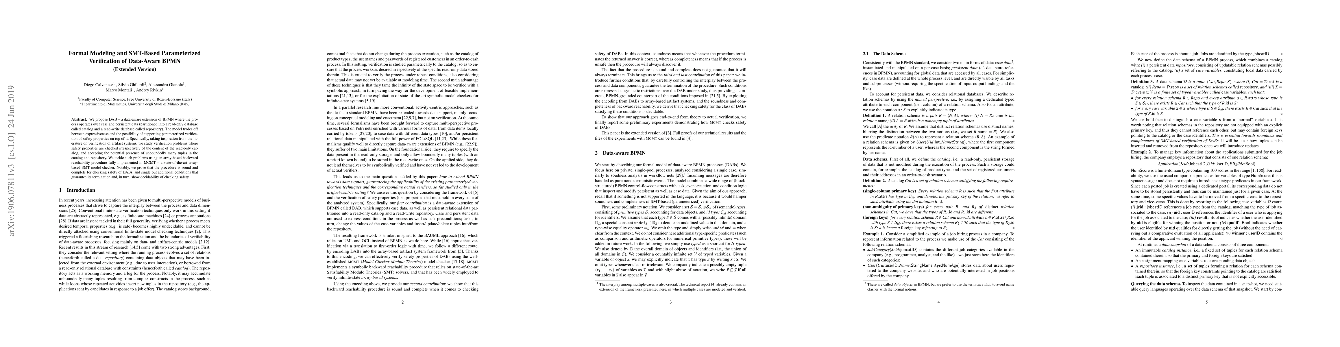 This paper introduces DAB, a data-aware extension of BPMN, and proposes a parameterized verification method using SMT-based model checking to ensure safety properties, independent of data content. The study proves the soundness and completeness of the verification procedure and establishes conditions for its termination and decidability.