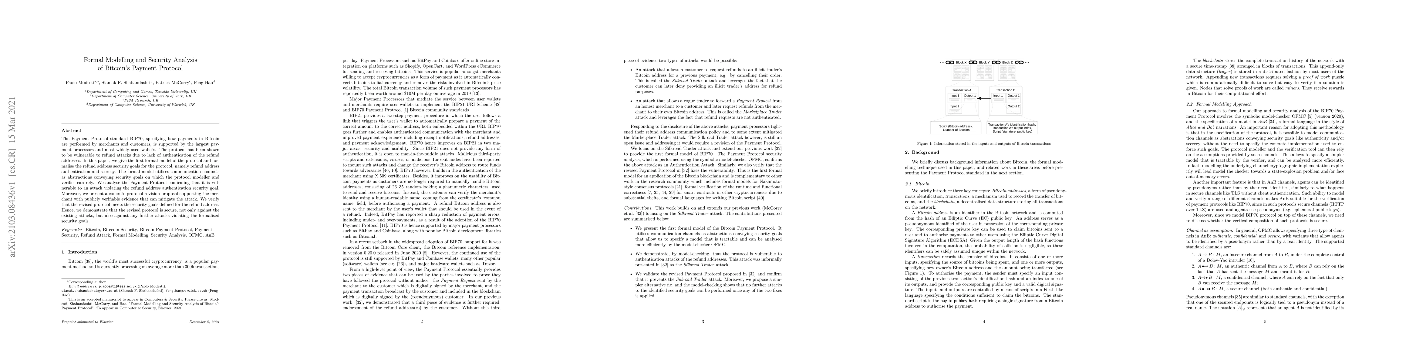 This paper provides the first formal model of Bitcoin's Payment Protocol (BIP70) and identifies vulnerabilities, particularly refund attacks due to lack of refund address authentication. It proposes a revised protocol that includes publicly verifiable evidence to mitigate these attacks and confirms its security through formal analysis.