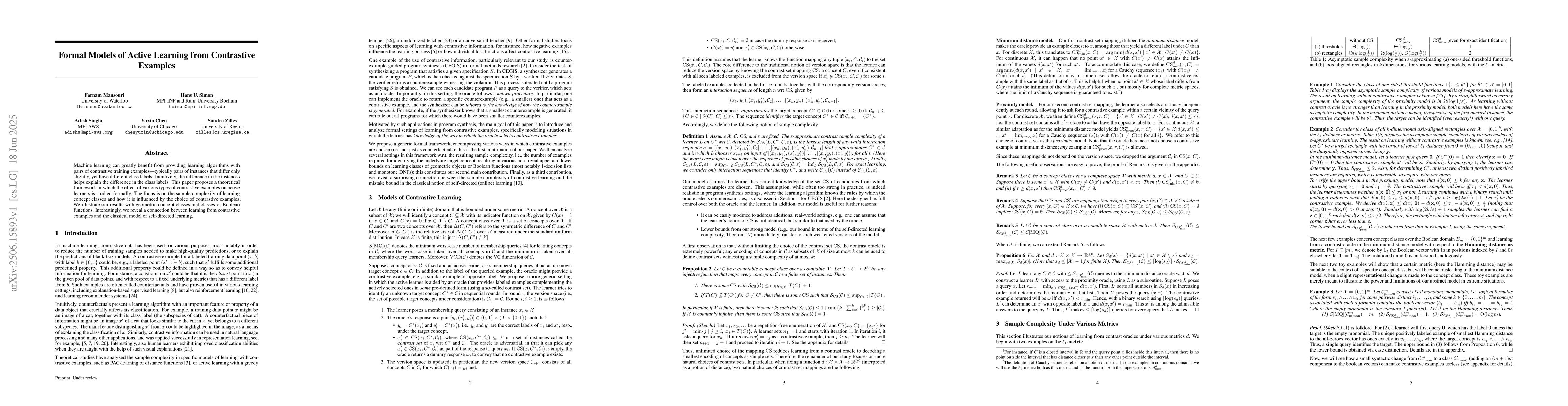 Machine learning can greatly benefit from providing learning algorithms with pairs of contrastive training examples -- typically pairs of instances that differ only slightly, yet have different class labels. Intuitively, the difference in the instances helps explain the difference in the class labels. This paper proposes a theoretical framework in which the effect of various types of contrastive examples on active learners is studied formally. The focus is on the sample complexity of learning concept classes and how it is influenced by the choice of contrastive examples. We illustrate our results with geometric concept classes and classes of Boolean functions. Interestingly, we reveal a connection between learning from contrastive examples and the classical model of self-directed learning.