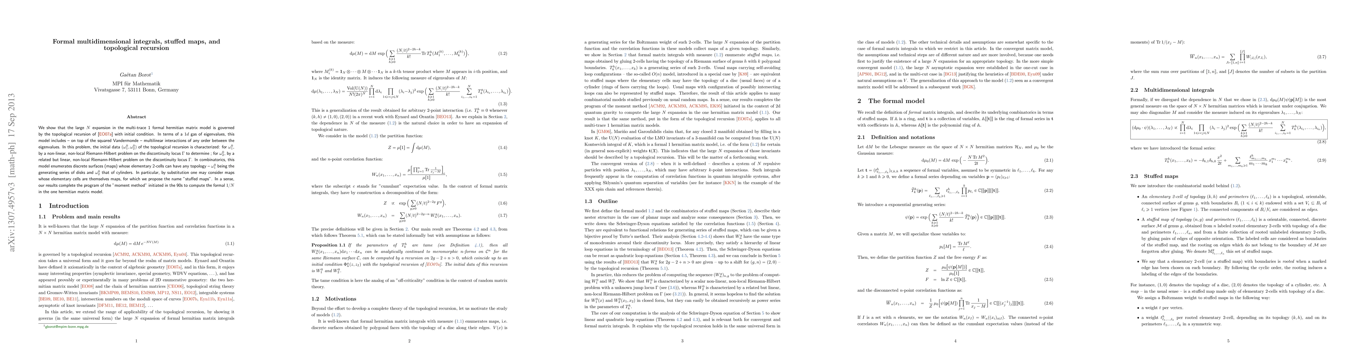 We show that the large N expansion in the multi-trace 1 formal hermitian matrix model is governed by the topological recursion of [Eynard and Orantin, 2007] with initial conditions. In terms of a 1d gas of eigenvalues, this model includes - on top of the squared Vandermonde - multilinear interactions of any order between the eigenvalues. In this problem, the initial data (W10,W20) of the topological recursion is characterized: for W10, by a non-linear, non-local Riemann-Hilbert problem on a discontinuity locus to determine ; for W20, by a related but linear, non-local Riemann-Hilbert problem on the discontinuity locus. In combinatorics, this model enumerates discrete surfaces (maps) whose elementary 2-cells can have any topology - W10 being the generating series of disks and W20 that of cylinders. In particular, by substitution one may consider maps whose elementary cells are themselves maps, for which we propose the name "stuffed maps". In a sense, our results complete the program of the "moment method" initiated in the 90s to compute the formal 1/N in the one hermitian matrix model.