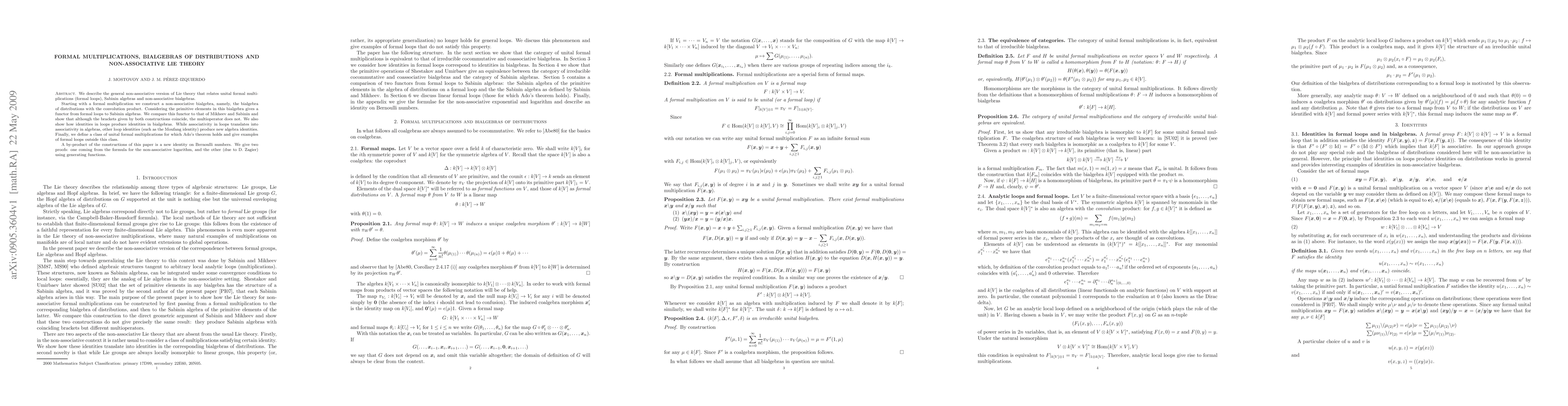 We describe the general non-associative version of Lie theory that relates unital formal multiplications (formal loops), Sabinin algebras and non-associative bialgebras. Starting with a formal multiplication we construct a non-associative bialgebra, namely, the bialgebra of distributions with the convolution product. Considering the primitive elements in this bialgebra gives a functor from formal loops to Sabinin algebras. We compare this functor to that of Mikheev and Sabinin and show that although the brackets given by both constructions coincide, the multioperator does not. We also show how identities in loops produce identities in bialgebras. While associativity in loops translates into associativity in algebras, other loop identities (such as the Moufang identity) produce new algebra identities. Finally, we define a class of unital formal multiplications for which Ado's theorem holds and give examples of formal loops outside this class. A by-product of the constructions of this paper is a new identity on Bernoulli numbers. We give two proofs: one coming from the formula for the non-associative logarithm, and the other (due to D. Zagier) using generating functions.
