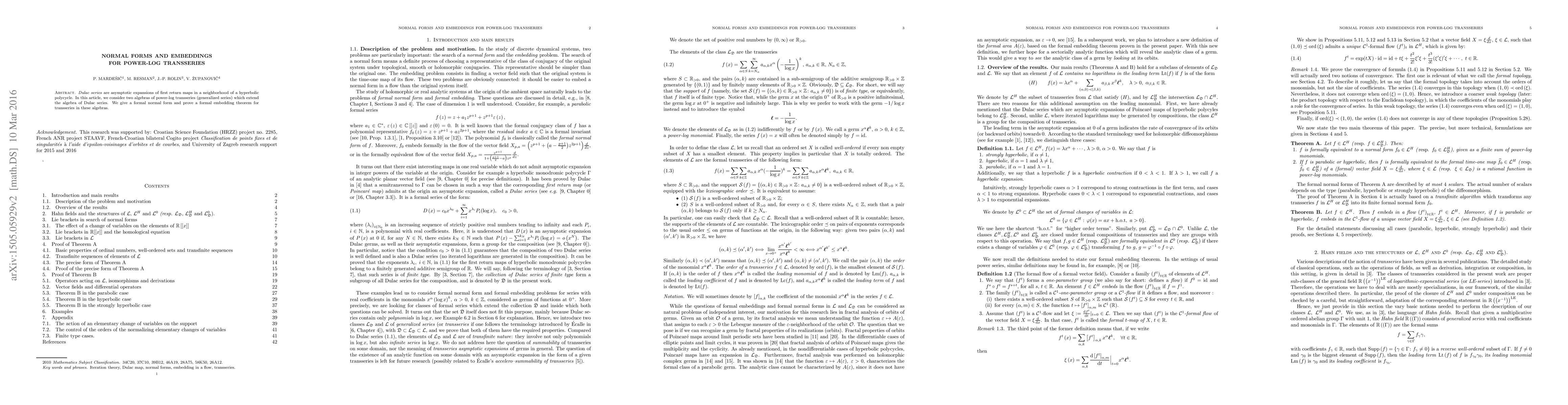 The Dulac series are the asymptotic expansions of first return maps in a neighborhood of a hyperbolic polycycle. In this article, we consider two algebras and of power-log transseries (generalized series) which extend the algebra of Dulac series. We give a formal normal form and prove a formal embedding theorem for transseries in these algebras.