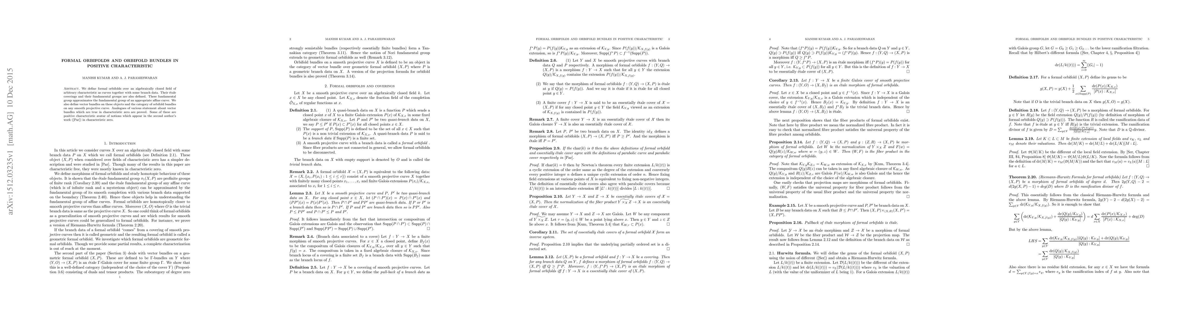 Summary: This paper introduces formal orbifolds over fields of positive characteristic, defines their coverings and fundamental groups, and establishes the category of orbifold bundles. It also proves analogues of characteristic zero results for vector bundles on these orbifolds.