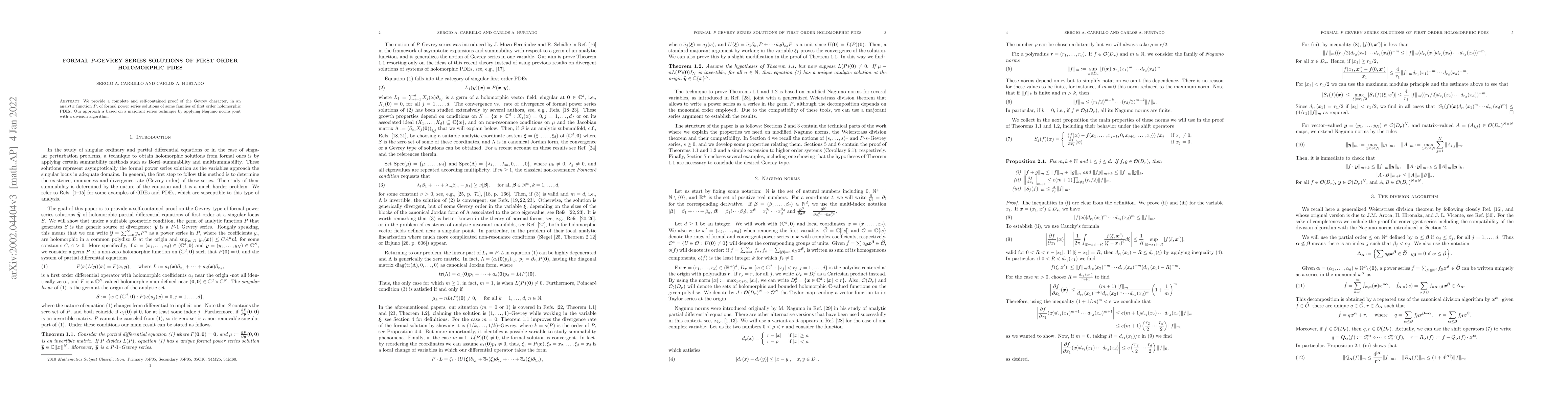 This paper proves the existence of formal $P$-Gevrey series solutions for first-order holomorphic PDEs using a majorant series technique and Nagumo norms, combined with a division algorithm. The proof establishes the Gevrey character of these solutions comprehensively.