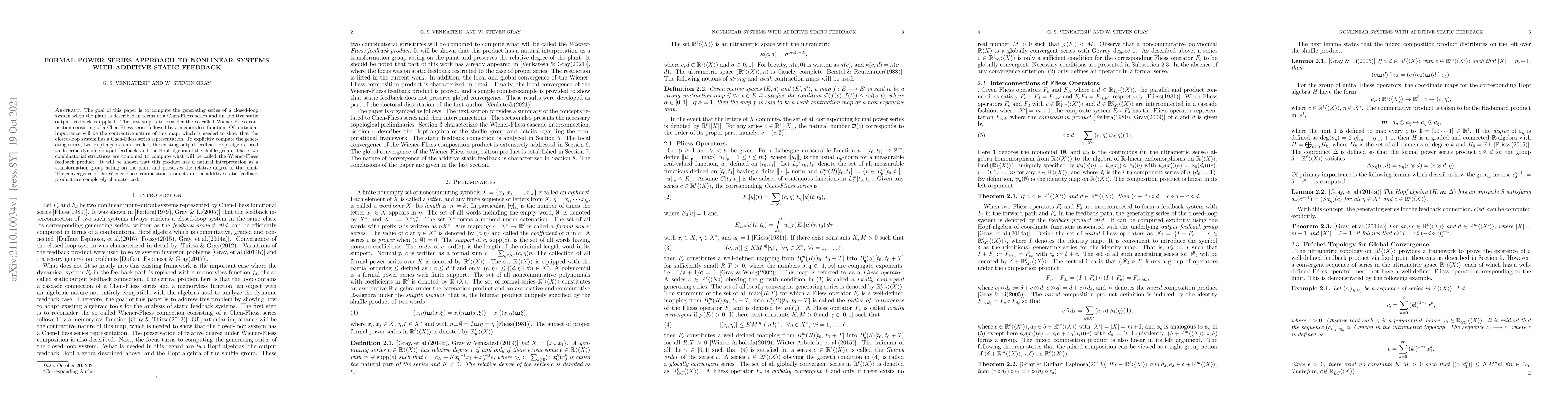 This paper develops a formal power series approach to analyze nonlinear systems with additive static feedback, leveraging Chen-Fliess series and Wiener-Fliess connections. It employs Hopf algebras to compute the generating series and characterizes the convergence of the Wiener-Fliess composition product.