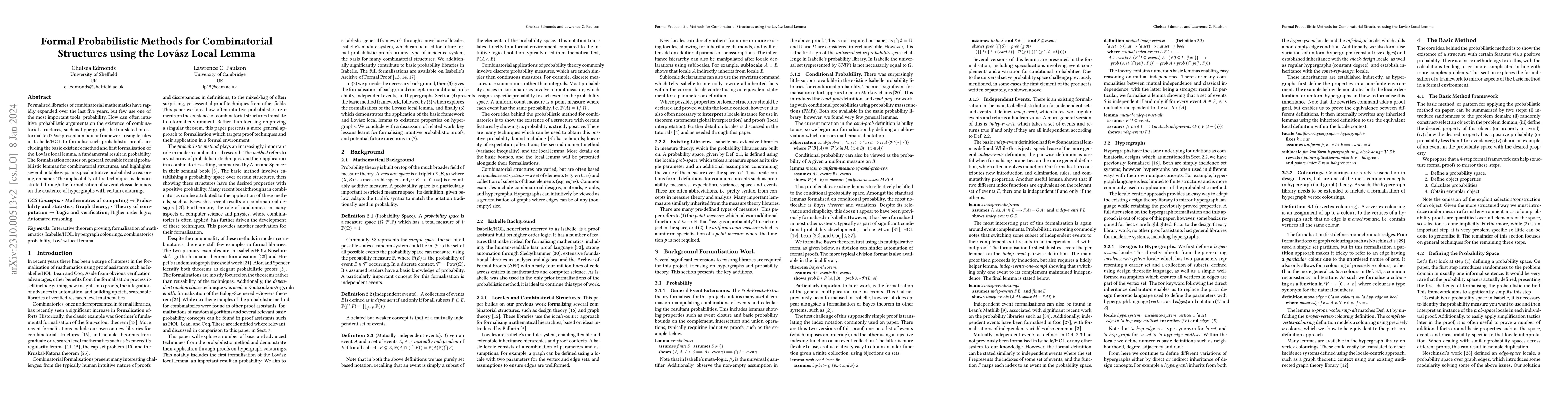 This paper presents a modular framework in Isabelle/HOL to formalise probabilistic proofs for combinatorial structures, including the first formalisation of the Lovász Local Lemma. It highlights the translation of intuitive probabilistic arguments into formal proofs and demonstrates the framework's applicability through classic lemmas on hypergraph colourings.
