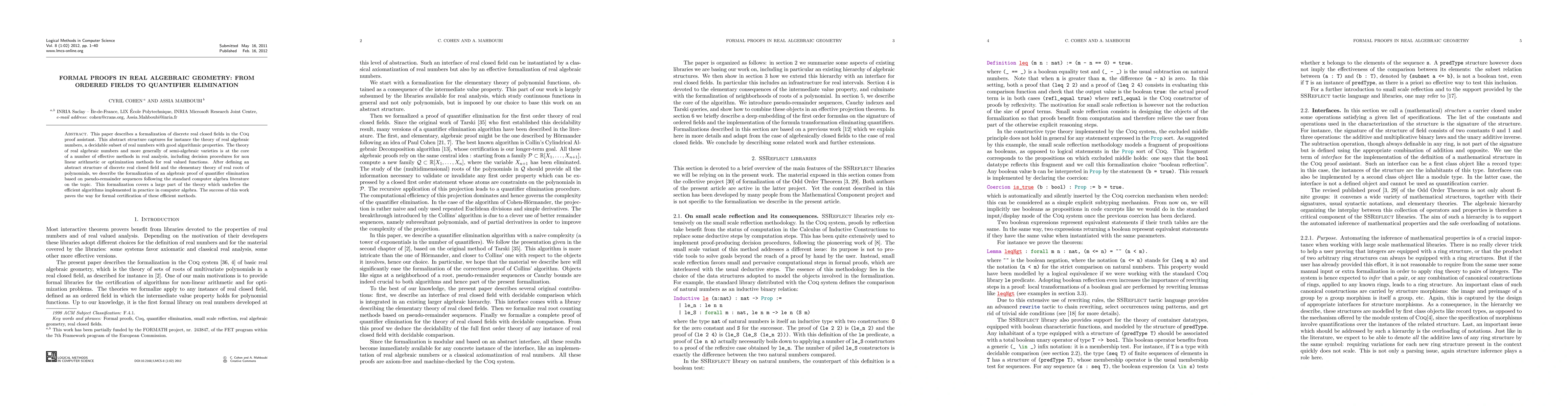 This paper formalizes the theory of discrete real closed fields in Coq, focusing on real algebraic numbers and semi-algebraic varieties, and presents a formal proof of quantifier elimination using pseudo-remainder sequences, laying the groundwork for certifying practical algorithms in computer algebra.