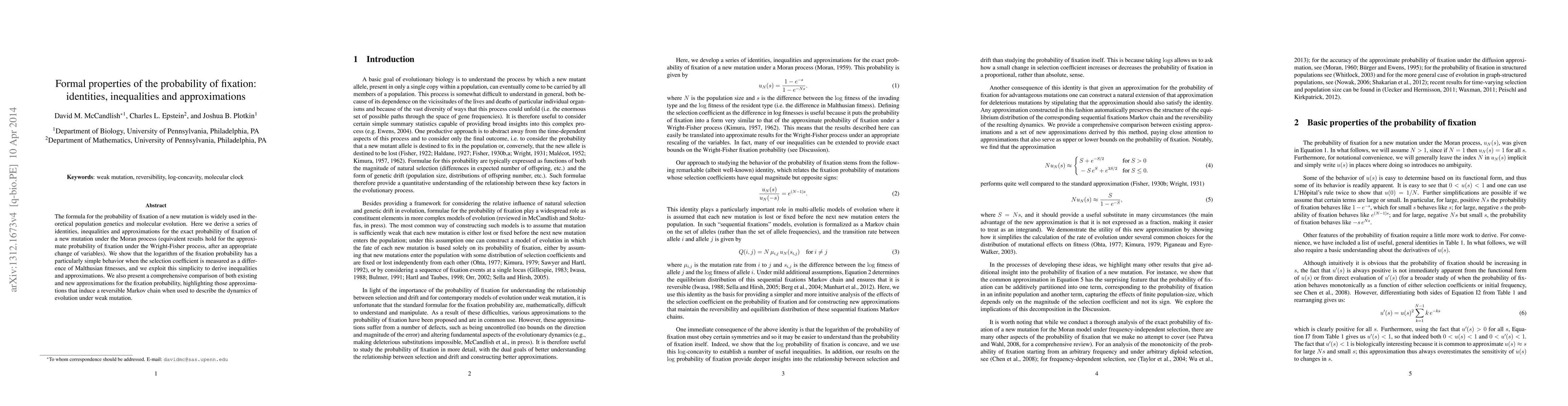 The formula for the probability of fixation of a new mutation is widely used in theoretical population genetics and molecular evolution. Here we derive a series of identities, inequalities and approximations for the exact probability of fixation of a new mutation under the Moran process (equivalent results hold for the approximate probability of fixation for the Wright-Fisher process after an appropriate change of variables). We show that the behavior of the logarithm of the probability of fixation is particularly simple when the selection coefficient is measured as a difference of Malthusian fitnesses, and we exploit this simplicity to derive several inequalities and approximations. We also present a comprehensive comparison of both existing and new approximations for the probability of fixation, highlighting in particular approximations that result in a reversible Markov chain when used to model the dynamics of evolution under weak mutation.