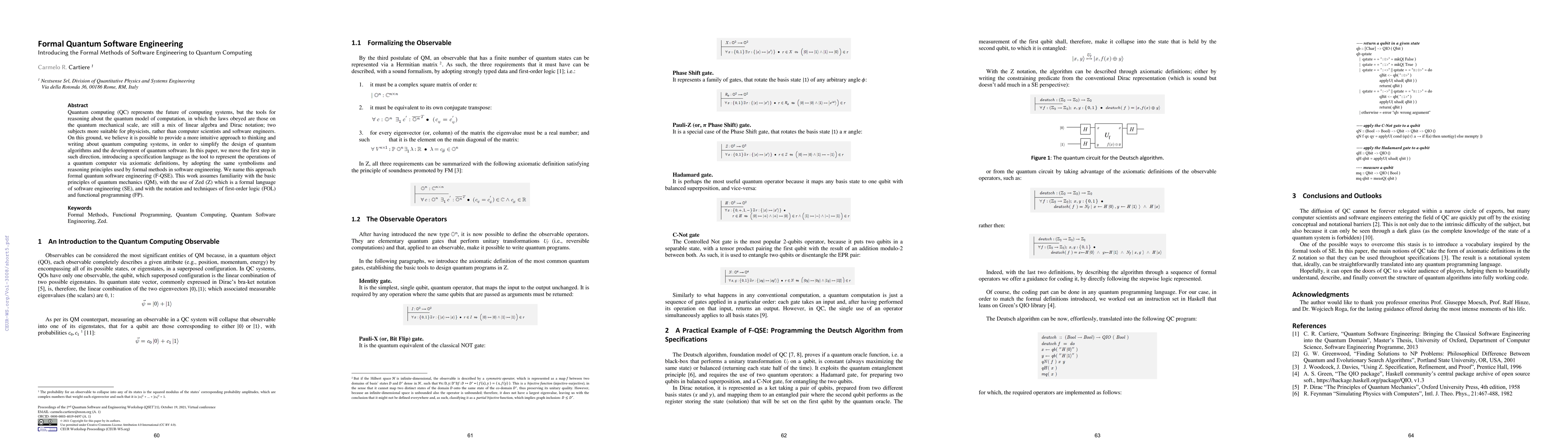 This paper introduces formal quantum software engineering (F-QSE), aiming to bridge the gap between quantum mechanics and software engineering by using formal methods to simplify quantum computing design and development. It proposes a specification language based on axiomatic definitions and familiar formal language symbolisms to represent quantum computer operations.