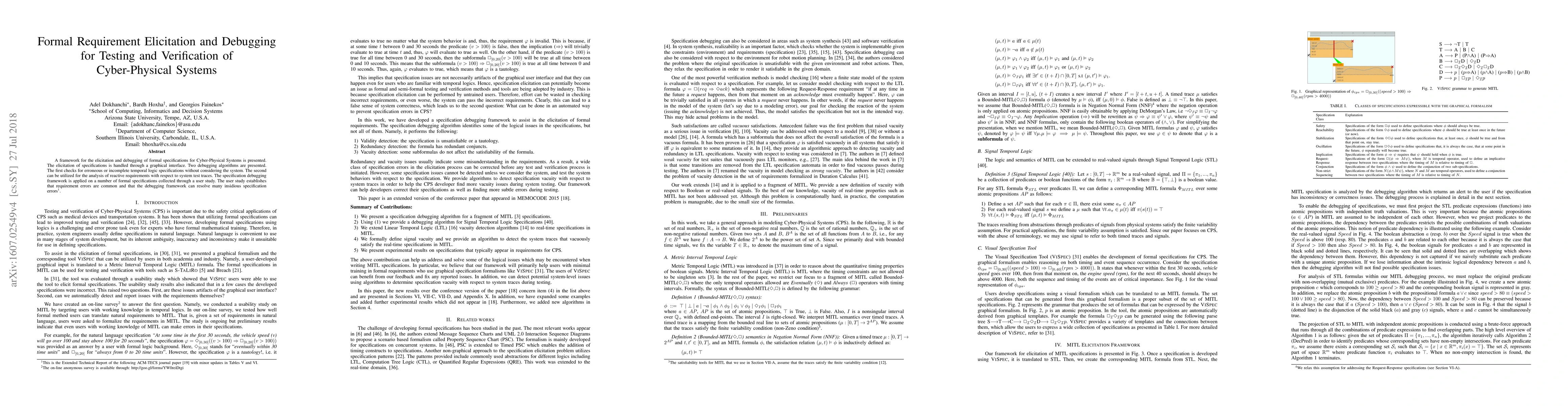 This paper introduces a framework for eliciting and debugging formal specifications for Cyber-Physical Systems using a graphical interface, and presents two debugging algorithms to identify errors in temporal logic specifications and analyze reactive requirements against system test traces. The framework's effectiveness is demonstrated through a user study showing common requirement errors and successful resolution by the debugging tools.