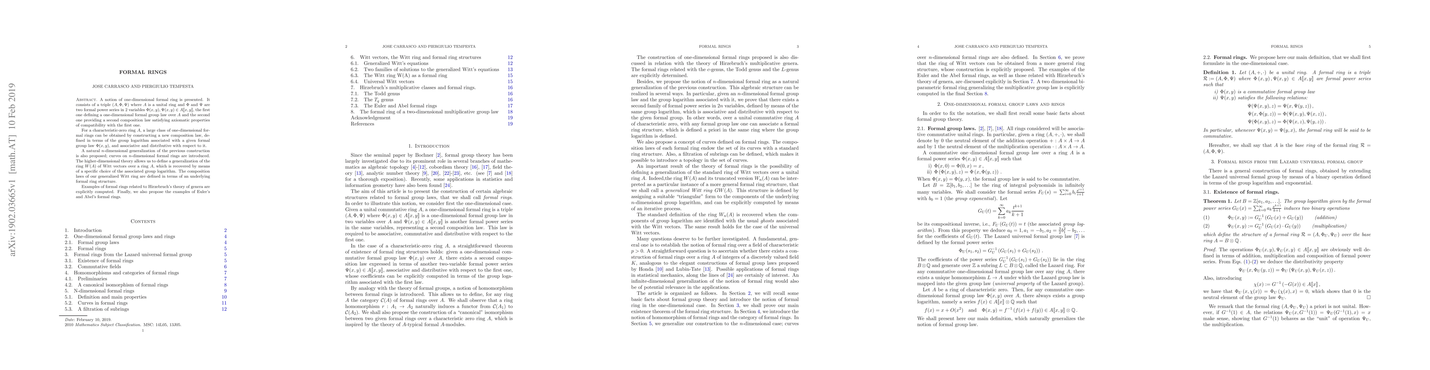 A notion of one-dimensional formal ring is presented. It consists of a triple $(A,\Phi,\Psi)$ where $A$ is a unital ring and $\Phi$ and $\Psi$ are two formal power series in $2$ variables ${\Phi(x,y),\Psi(x,y)\in A\llbracket x,y\rrbracket}$, the first one defining a one-dimensional formal group law over $A$ and the second one providing a second composition law satisfying axiomatic properties of compatibility with the first one. For a characteristic-zero ring $A$, a large class of one-dimensional formal rings can be obtained by constructing a new composition law, defined in terms of the group logarithm associated with a given formal group law $\Phi(x,y)$, and associative and distributive with respect to it. A natural $n$-dimensional generalization of the previous construction is also proposed; curves on $n$-dimensional formal rings are introduced. The higher-dimensional theory allows us to define a generalization of the ring $W(A)$ of Witt vectors over a ring $A$, which is recovered by means of a specific choice of the associated group logarithm. The composition laws of our generalized Witt ring are defined in terms of an underlying formal ring structure. Examples of formal rings related to Hirzebruch's theory of genera are explicitly computed. Finally, we also propose the examples of Euler's and Abel's formal rings.