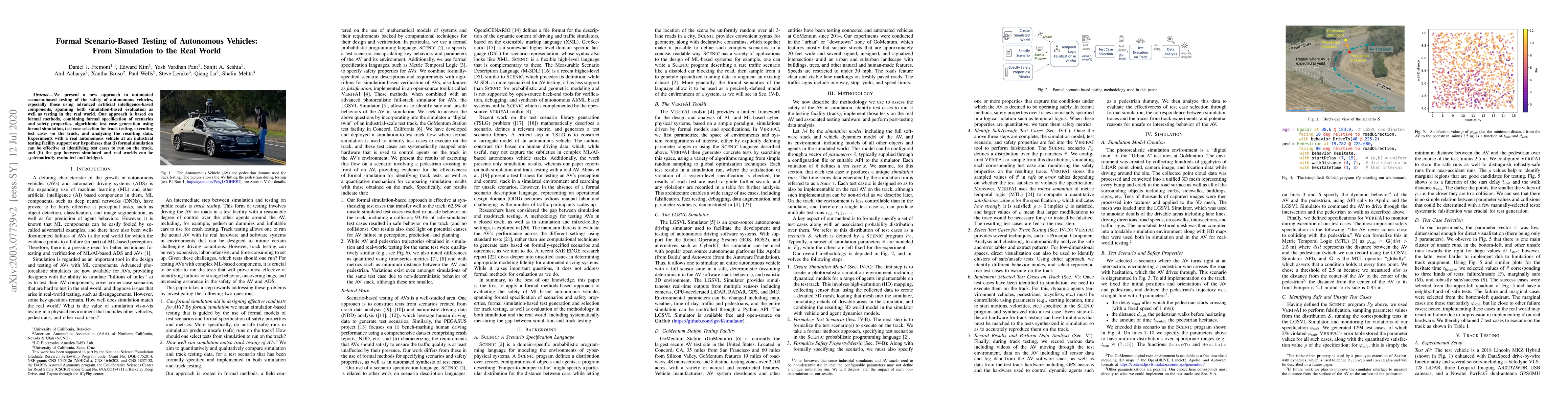 We present a new approach to automated scenario-based testing of the safety of autonomous vehicles, especially those using advanced artificial intelligence-based components, spanning both simulation-based evaluation as well as testing in the real world. Our approach is based on formal methods, combining formal specification of scenarios and safety properties, algorithmic test case generation using formal simulation, test case selection for track testing, executing test cases on the track, and analyzing the resulting data. Experiments with a real autonomous vehicle at an industrial testing facility support our hypotheses that (i) formal simulation can be effective at identifying test cases to run on the track, and (ii) the gap between simulated and real worlds can be systematically evaluated and bridged.
