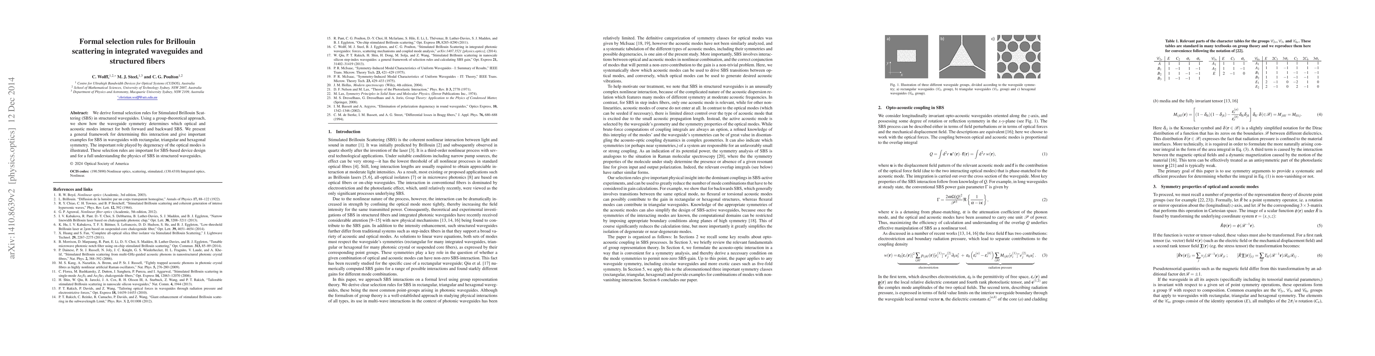 This paper derives formal selection rules for Stimulated Brillouin Scattering (SBS) in structured waveguides using a group-theoretical approach, showing how waveguide symmetry influences optical and acoustic mode interactions. The rules are crucial for SBS-based device design and understanding SBS physics in various waveguide geometries.
