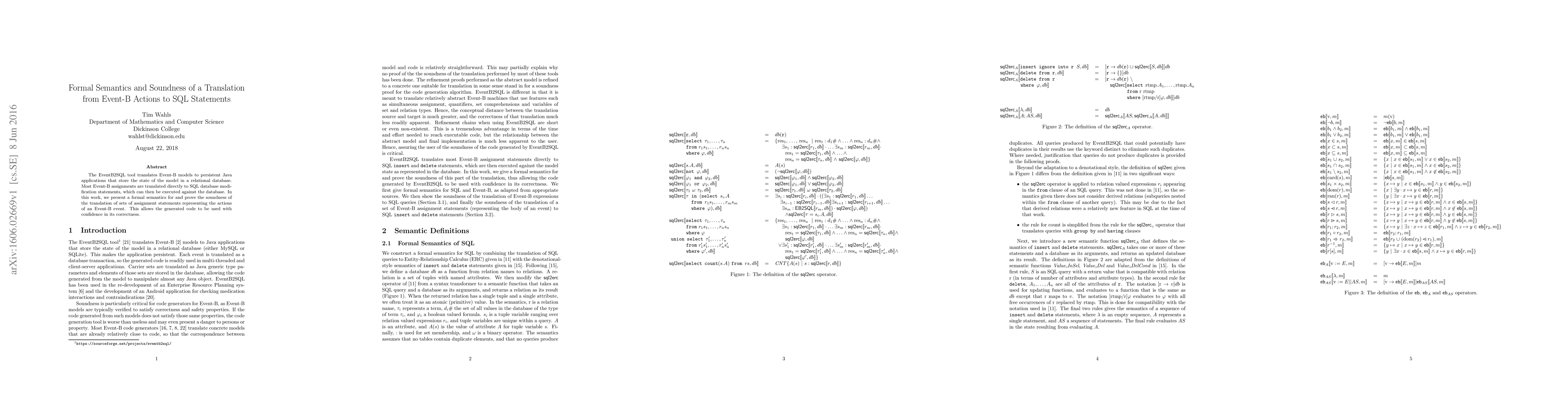 This paper presents a formal semantics and proves the soundness of the EventB2SQL tool's translation of Event-B actions into SQL statements, ensuring the correctness of the generated Java applications that store model states in relational databases.