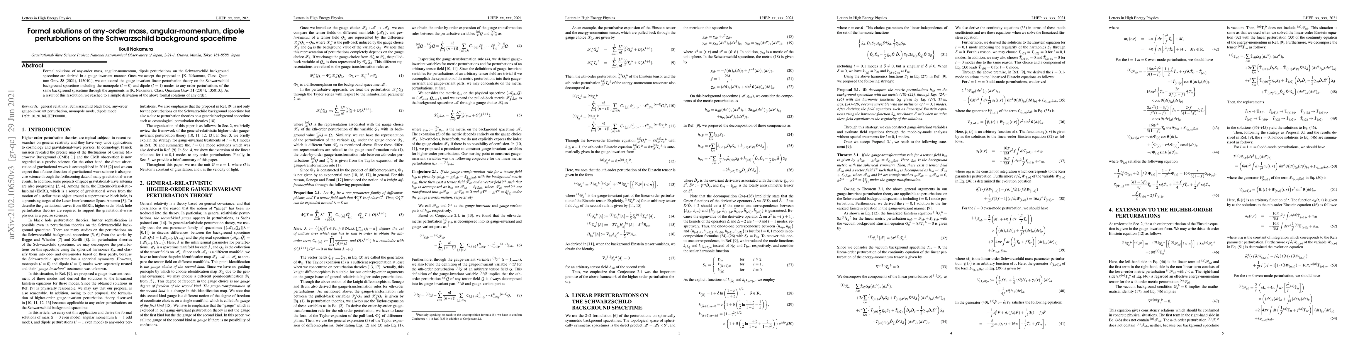 Formal solutions of any-order mass, angular-momentum, dipole perturbations on the Schwarzschild background spacetime are derived in a gauge-invariant manner. Once we accept the proposal in [K. Nakamura, Class. Quantum Grav. {\bf 38} (2021), 145010.], we can extend the gauge-invariant linear perturbation theory on the Schwarzschild background spacetime including the monopole ($l=0$) and dipole ($l=1$) modes to any-order perturbations of the same background spacetime through the arguments in [K. Nakamura, Class. Quantum Grav. {\bf 31} (2014), 135013.]. As a result of this resolution, we reached to a simple derivation of the above formal solutions of any order.