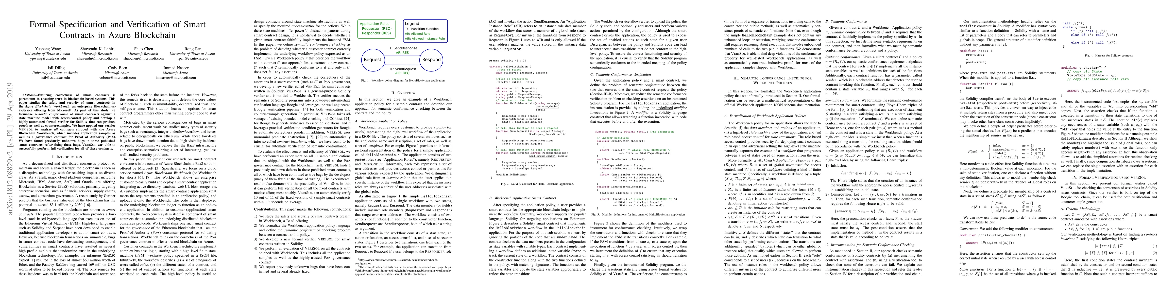 This paper develops a formal verification method for smart contracts in Azure Blockchain Workbench, discovering and fixing previously unknown bugs in published contracts. The method, VeriSol, automates the verification process to ensure correctness and security.