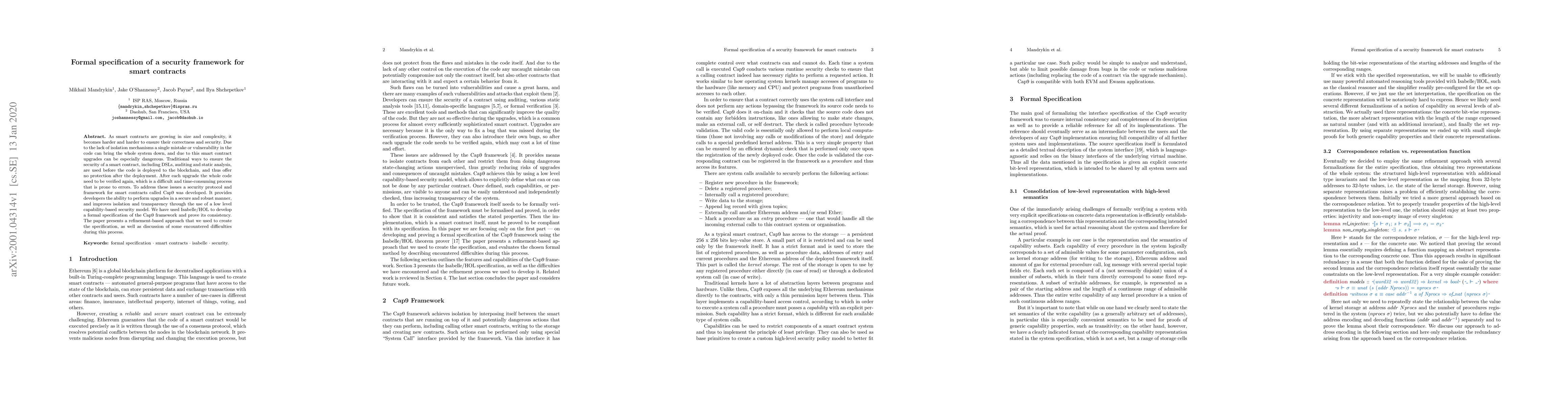This paper proposes a security framework, Cap9, for smart contracts to facilitate secure upgrades and improve code isolation and transparency using a capability-based model. The authors developed a formal specification in Isabelle/HOL to prove the framework's consistency, employing a refinement-based approach and discussing encountered challenges.