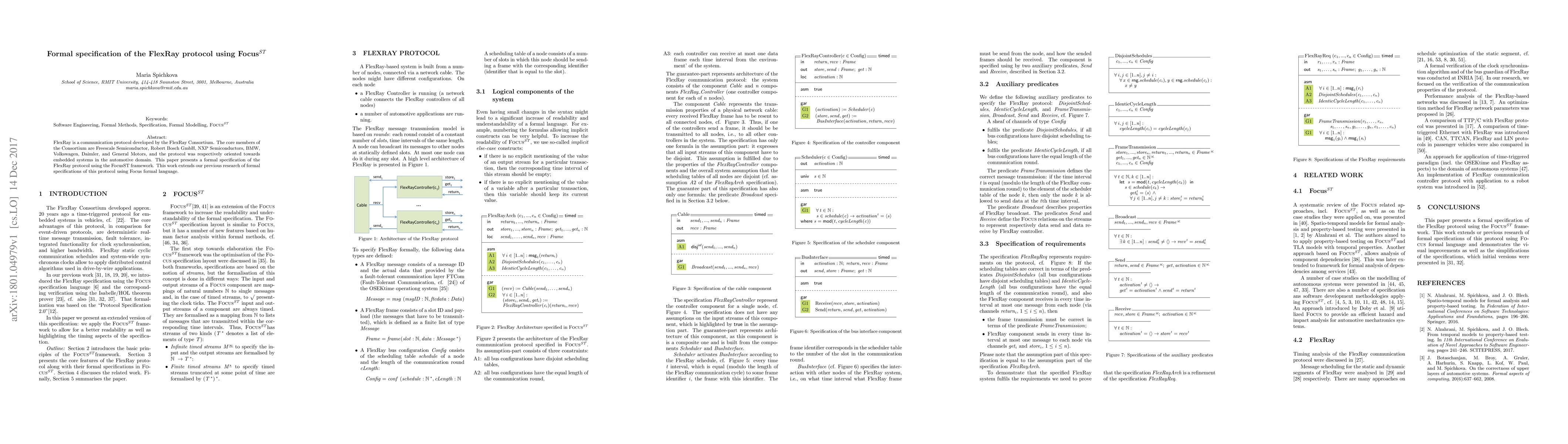 FlexRay is a communication protocol developed by the FlexRay Consortium. The core members of the Consortium are Freescale Semiconductor, Robert Bosch GmbH, NXP Semiconductors, BMW, Volkswagen, Daimler, and General Motors, and the protocol was respectively oriented towards embedded systems in the automotive domain. This paper presents a formal specification of the FlexRay protocol using the FocusST framework. This work extends our previous research of formal specifications of this protocol using Focus formal language.